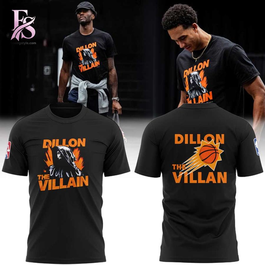 What sets this shirt apart is its striking visual design: fiery orange lettering spells out “DILLON THE VILLAIN” on both sides, with a shadowy hooded figure ablaze on the front for that dramatic, edge-of-your-seat energy. The back amps it up with a Suns basketball sunburst woven into the text, symbolizing Brooks’ villainous spark on the court. Subtle textures in the graphic add depth, while the NBA sleeve patch authenticates its pro-level appeal. Whether you’re channeling Brooks’ defensive prowess or just embracing the anti-hero vibe, this tee lets you express unapologetic team spirit with emotional punch-feel the thrill of Suns victories every time you wear it.