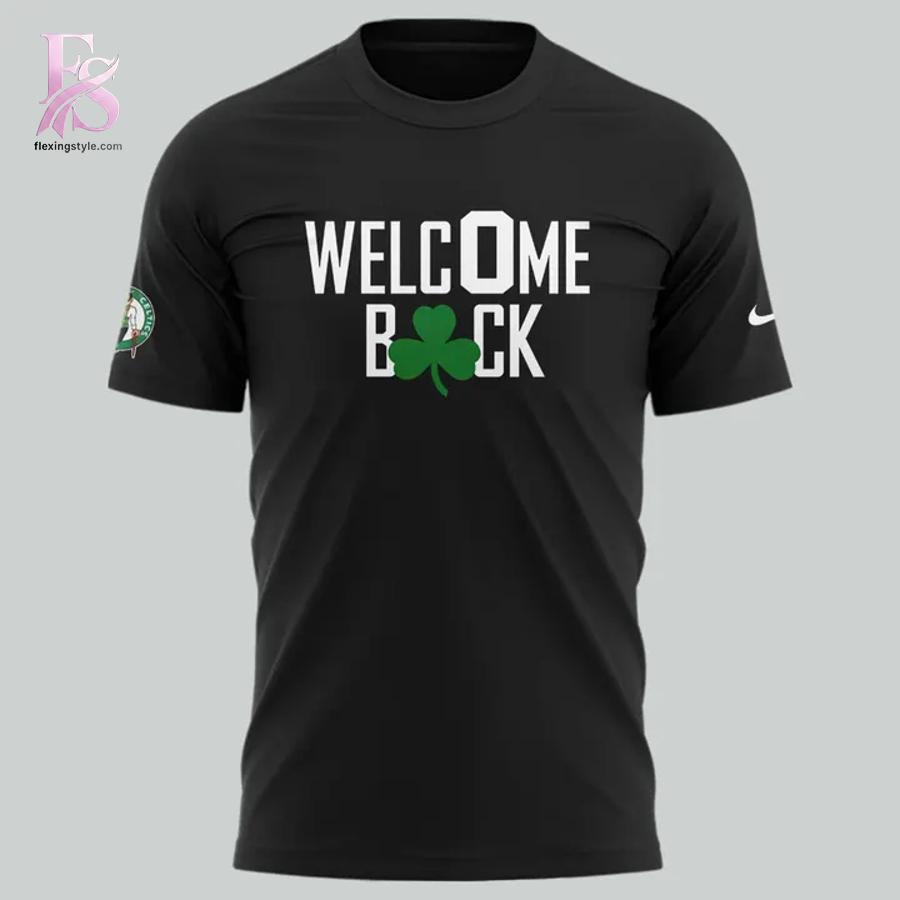 At the center of the design is a striking “WELCOME B☘CK” graphic across the chest, with the “O” creatively replaced by a classic green shamrock-an unmistakable symbol of Celtics pride. The vibrant clover pops against the deep black fabric, giving the shirt a modern yet timeless sports look. On the back, the design features TATUM and the number 0 in clean, bold lettering, inspired by the iconic jersey style worn on the court. Subtle team details on the sleeve and neckline add an extra layer of authenticity that true fans will appreciate.