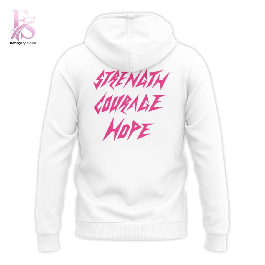 What truly sets this UConn Huskies hoodie apart is its eye-catching visual design. The front features electrifying “Play 4 Kay” graffiti-style lettering in vivid pink and purple tones, complete with jagged lightning-like edges and a subtle mamba emblem nodding to resilience and strength. Flip it around, and the back boldly declares “Strength Courage Hope” in slanted, motivational pink script – a powerful reminder of the fight against breast cancer. The crisp white base lets these vibrant accents pop, creating a dynamic, empowering look that’s as stylish as it is symbolic.