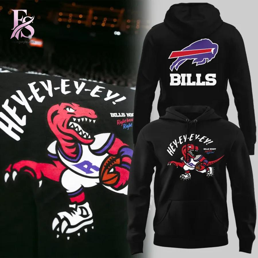 The front showcases a fierce red T-Rex mascot dressed in Buffalo Bills colors-blue, red, and white-clutching a basketball with attitude. The playful “HEY-EY-EY-EY!!” text arcs overhead, capturing the energy and hype of game day. Additional text reads “Bills Night” and “Right Now, Right Here,” cementing this as a special collaboration piece. The dinosaur’s aggressive stance and detailed graphics create a cartoonish yet powerful vibe that’s impossible to ignore.