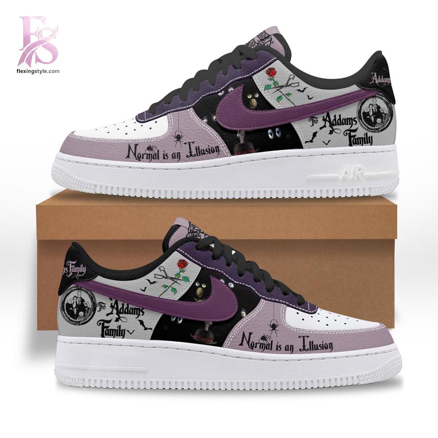 Visually, these Addams Family Air Force shoes captivate with a haunting purple and black colorway that evokes midnight mysteries. The lavender base fades into deep ebony accents, highlighted by intricate graphics: a thorny rose clipped by scissors, shadowy bats in flight, a lurking spider, and peeking eerie eyes that add a playful yet sinister touch. Bold script declares “Normal is an Illusion” along the side, flanked by “The Addams Family” emblems and character portraits that pay homage to the beloved franchise. The white midsole provides a stark contrast, grounding the design in classic sneaker appeal while the textured details give it a hand-drawn, artistic flair.