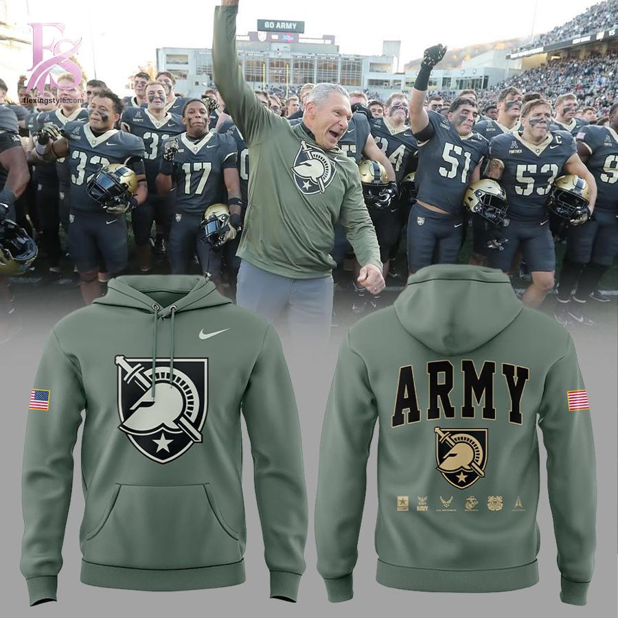 Inspired by the iconic sideline moment where the Army football coach’s smile captures pure victory and unity, this hoodie blends powerful imagery with clean, athletic design. The front features the bold Army Black Knights emblem, sharp and commanding against a deep olive green base that reflects military heritage and strength. The back design elevates the look with large “ARMY” lettering paired with the classic helmet logo, creating a strong, unmistakable presence whether you’re at the stadium or on the street. Subtle patriotic sleeve details add an extra layer of meaning without overpowering the overall aesthetic.