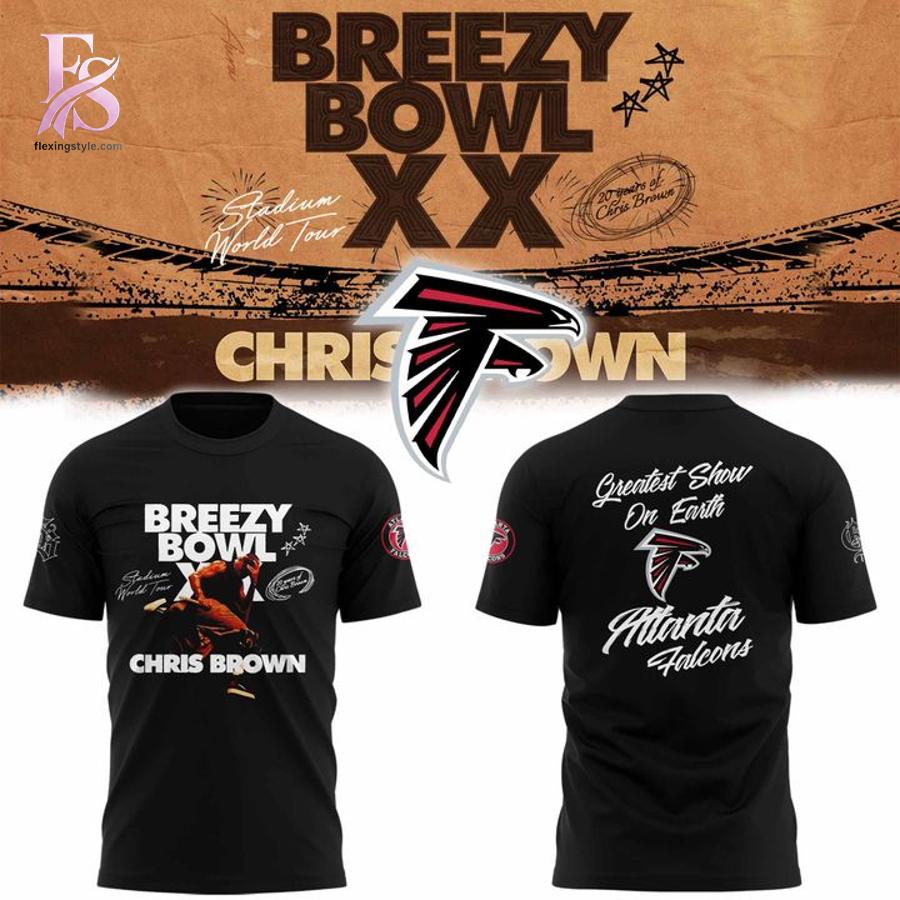The Front: Dominated by the bold “BREEZY BOWL XX” header, the center graphic features a high-energy image of Chris Brown in performance mode, bathed in dynamic red lighting that matches the Falcons’ color scheme. It also features “Stadium World Tour” script and a commemorative “20 Years of Chris Brown” stamp, celebrating two decades of hits.