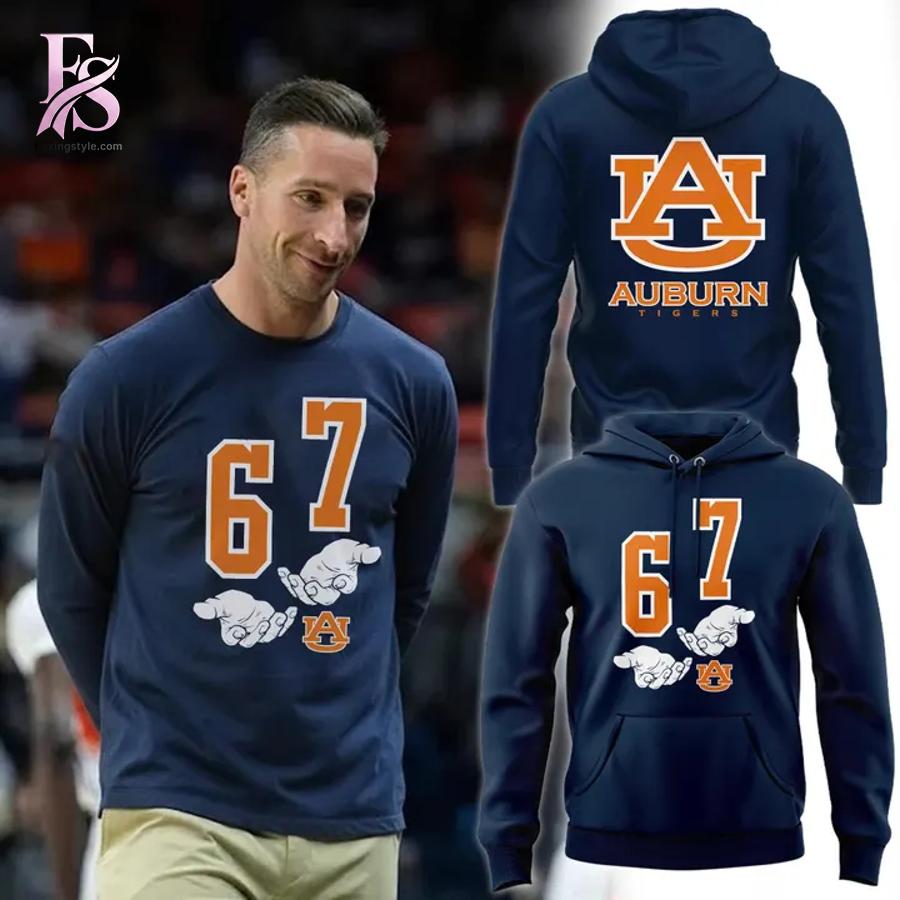 The design of the Auburn Tigers 67 Basketball Hoodie is a masterclass in clean, impactful branding. The front prominently displays the number “67” in a classic varsity font, accompanied by a unique graphic of gloved hands showcasing the Auburn spirit. Turn it around to reveal the massive, officially licensed “AU” interlocking logo centered on the back, underscored by the bold “AUBURN TIGERS” text. This dual-sided design ensures your team spirit is visible from every angle, making it a standout addition to any fan’s collection.