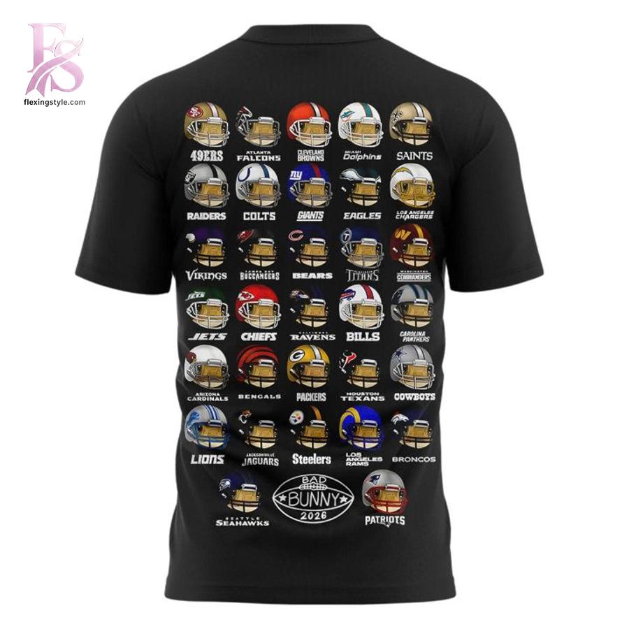This limited-edition black tee nails the crossover every NFL fan and Bad Bunny lover has been waiting for. On the front, a crisp white NFL shield logo keeps things clean and classic. Flip it around and the back explodes into an eye-catching grid of every single NFL team helmet-49ers, Chiefs, Cowboys, Eagles, you name it-rendered in vibrant, authentic team colors with the team name printed right underneath. Bold “SUPER TAZÓN 02/08 LX 2026” lettering crowns the design, flanked by the official Super Bowl LX logo and Bad Bunny’s iconic 2026 oval stamps that look straight off a collector’s cereal box. The whole layout feels playful, nostalgic, and seriously hype-like wearing the entire league on your back while repping the biggest Latin music star on the planet.