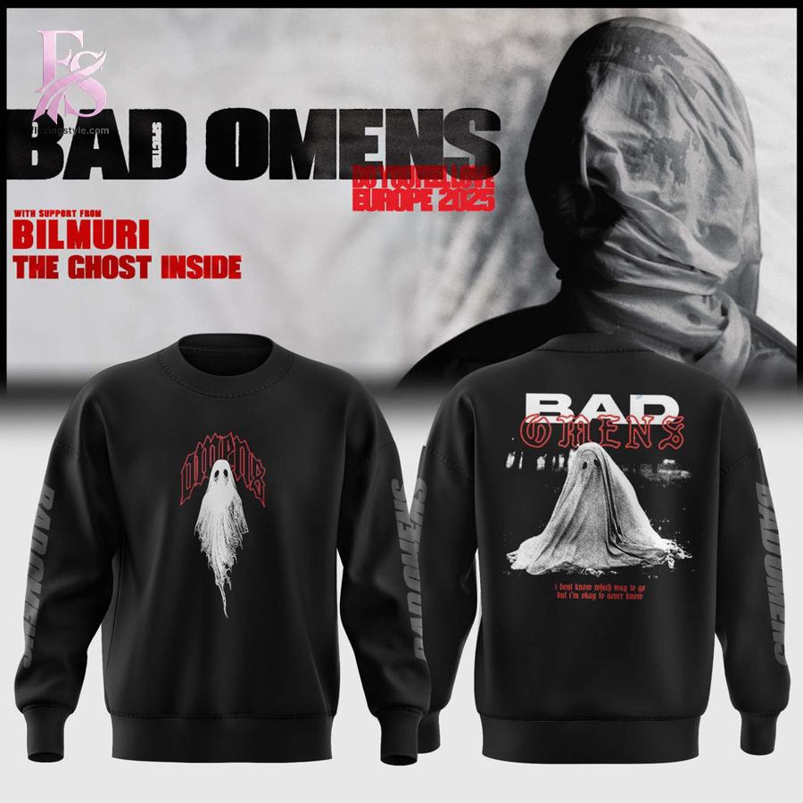 BAD OMENS Tour Collection sweatshirt, featuring haunting ghostly designs that capture the band’s signature atmospheric sound. This premium black crewneck showcases two striking supernatural artwork variations, making it an essential piece for any alternative music enthusiast.