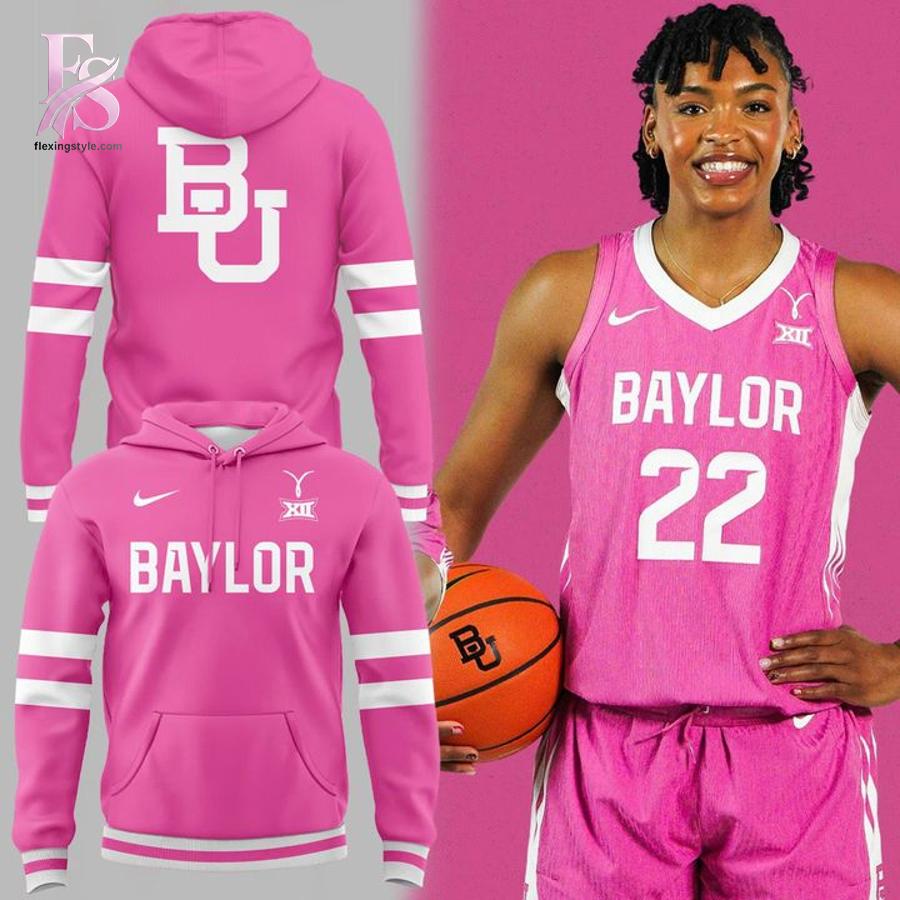 Dressed in a vibrant breast cancer awareness pink, this hoodie instantly commands attention. The front features crisp white BAYLOR lettering across the chest, paired with athletic detailing inspired by the team’s official game uniforms. Clean white sleeve stripes add a classic varsity touch, while the iconic BU logo stands proudly on the back for a strong, unmistakable finish. Subtle sport accents like the performance-style cut and smooth texture give it an authentic on-court feel that mirrors what the players wear.
