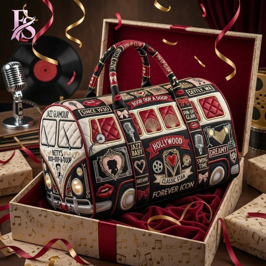 Right from the image, the bag steals the spotlight with its bold black-and-red color scheme that screams retro sophistication. Rich, quilted red diamond panels give it luxurious texture and depth, while the black body bursts with playful vintage graphics: classic Betty Boop illustrations, cherry-red lips, hearts, bows, vintage microphones, film reels, and a charming side panel styled like a 1930s roadster complete with “BETTY’S BOOP-OOP-A-DOOP.” Catchy phrases like “JAZZ GLAMOUR,” “SINCE 1930,” “HOLLYWOOD CLASSIC STAR,” “FOREVER ICON,” “JAZZ BABY,” and “DREAMY” pop in elegant lettering across the design. The matching handles proudly read “PIN-UP CLUB” and “JAZZ CLUB,” tying the whole look together with authentic 1930s jazz-age magic.
