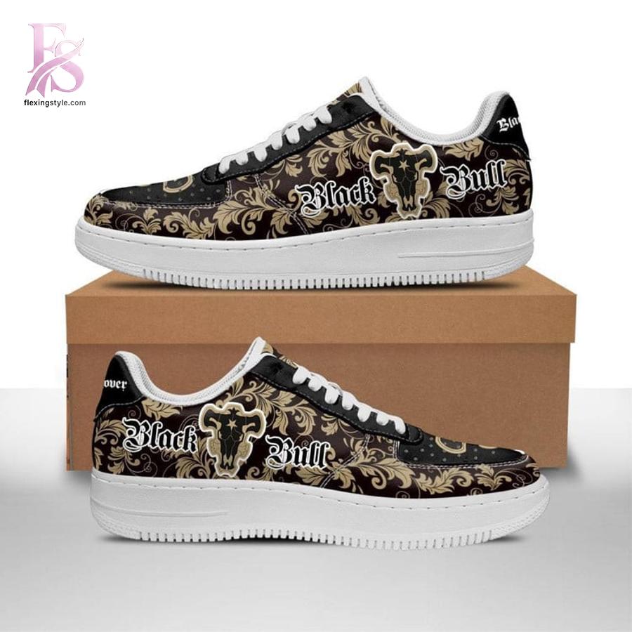 The design is a visual masterpiece of dark fantasy aesthetics, perfectly capturing the gritty yet regal atmosphere of the Black Clover universe. Each pair features an intricate, golden-tan filigree pattern that dances across a deep black base, providing a sophisticated backdrop for the squad’s iconography. The legendary Black Bull squad emblem is prominently displayed on the side panels, framed by the “Black Bull” name in a striking gothic font. Touches of “Black Clover” branding on the heel and a clean, crisp white midsole and laces provide a sharp contrast that ensures these custom sneakers command attention from every angle.