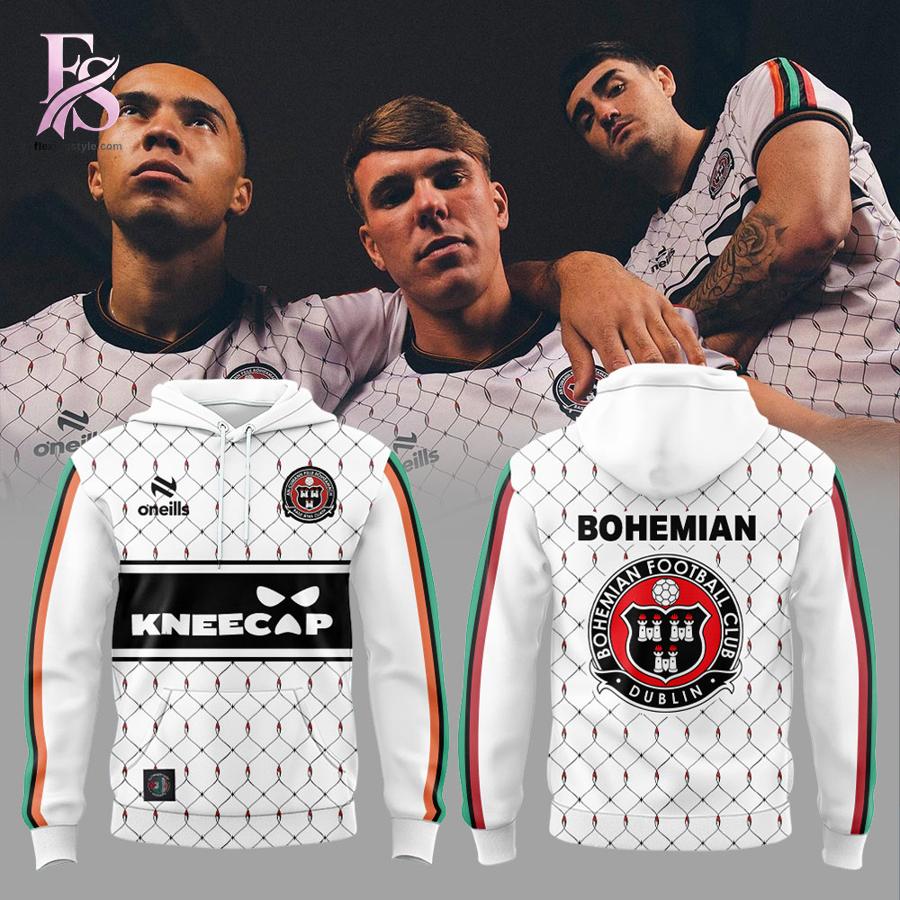 The design is a visual tribute to the club’s deep roots and its bold, progressive future. Featuring a sophisticated white base with an intricate, repeating diamond-grid pattern accented by small red details, the 2026 away hoodie offers a fresh take on classic terrace wear. The sleeves are adorned with vibrant vertical stripes of green, orange, and black, nodding to the club’s Irish identity. The front proudly displays the official Bohemian Football Club crest and the O’Neills logo, while the prominent Kneecap sponsor logo across the chest highlights the club’s unique collaboration with the iconic hip-hop group. Turning it around reveals a massive “BOHEMIAN” wordmark and a large-scale club crest, ensuring your allegiance is clear from every angle.