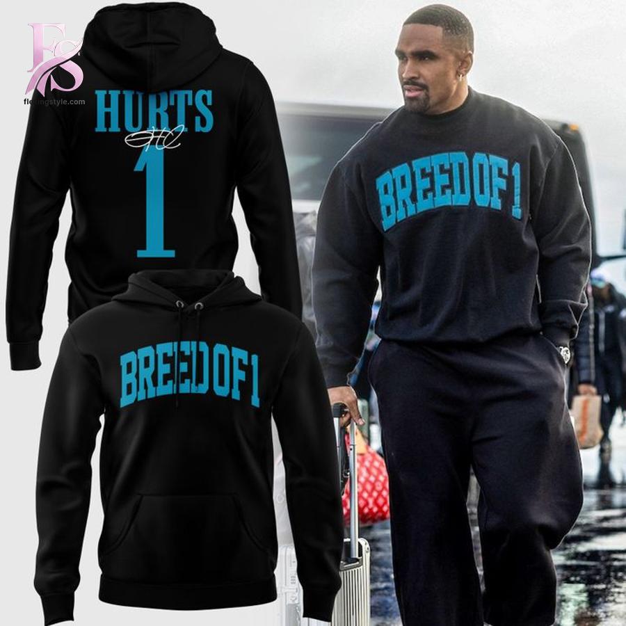Show your Eagles pride with the exclusive BREED OF 1 sweatshirt, a sleek tribute to Philadelphia’s elite quarterback legacy. This premium black crewneck features bold turquoise lettering, with two distinct designs available – the statement “BREED OF 1” across the chest, or “HURTS” with the number 1 on the back.