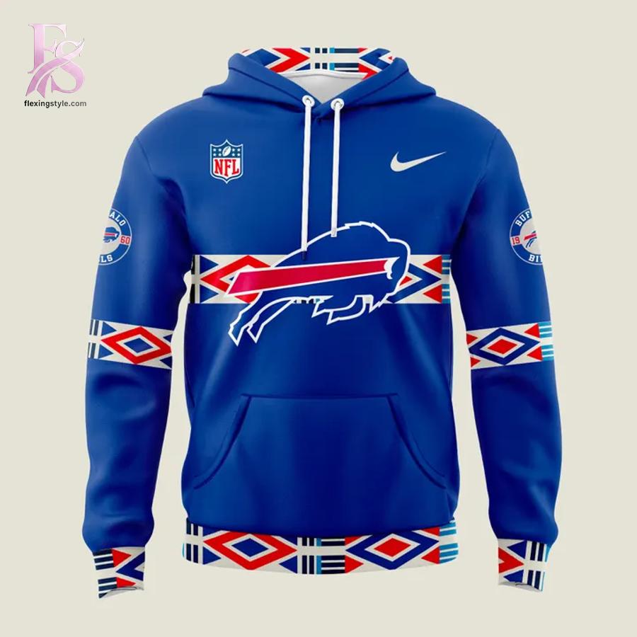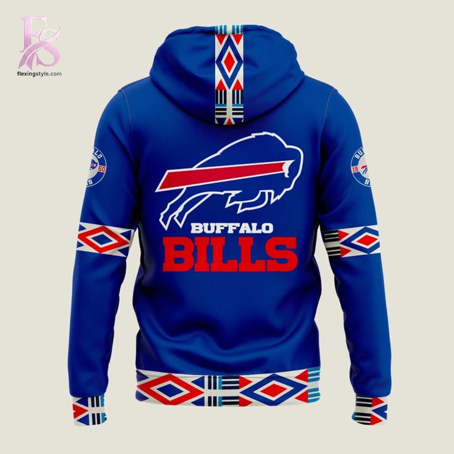 The design is a masterful blend of team identity and heritage-inspired artistry. Set against a striking royal blue base, the hoodie features intricate geometric patterns on the sleeves and waistline that reflect traditional Native American textile art, symbolizing unity and the enduring connection between earth and sky. The legendary Buffalo Bills charging logo is prominently displayed on the chest and back, integrated with these tribal motifs to create a look that is both modern and deeply rooted in history. A vibrant red-and-white “BUFFALO BILLS” wordmark anchors the back design, ensuring your team spirit is visible from every angle.