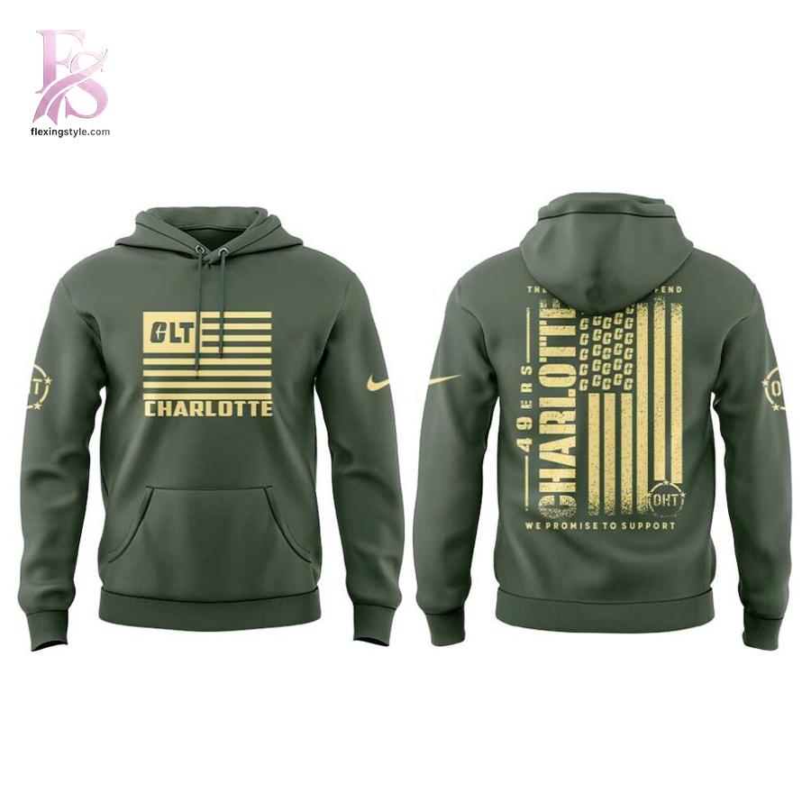 The hoodie features a distinguished olive green colorway, reminiscent of traditional military garments, with striking gold accents that elevate its premium appearance. The front showcases a bold “CLT CHARLOTTE” design incorporating elements of the American flag, while the back displays an innovative vertical flag pattern filled with the “CLT” monogram and the powerful message “WE PROMISE TO SUPPORT.”