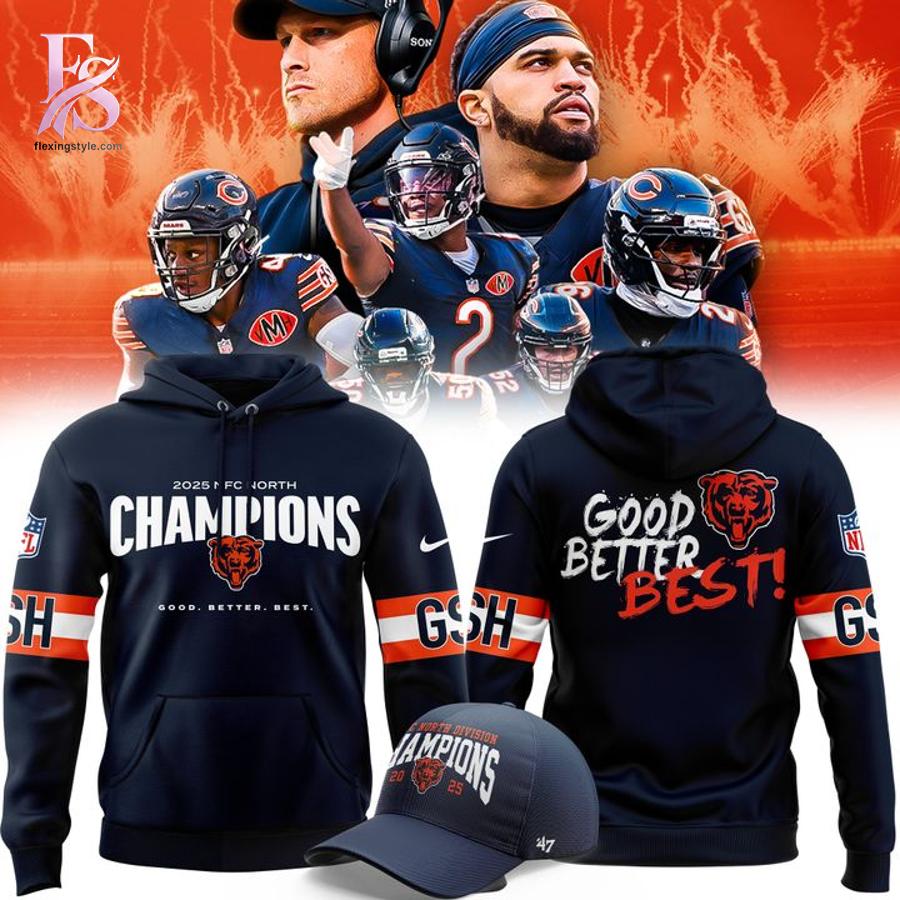 The design of this Chicago Bears champions hoodie is as bold as a fourth-quarter comeback. The front features a vibrant “2025 Division Champions” graphic, framed by the iconic wishbone “C” logo and the official NFC North branding. Every detail is crafted to capture the energy of coach Ben Johnson’s historic first season and Caleb Williams’ breakout performances. With sleek orange and navy blue accents pop against the deep charcoal base, this hoodie offers a modern, high-contrast look that stands out in any crowd of fans.
