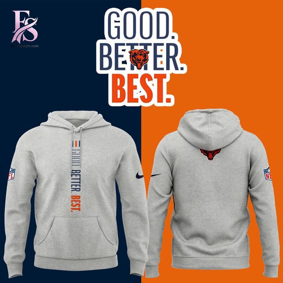 The design immediately makes an impact with the powerful GOOD. BETTER. BEST. slogan displayed in a clean, modern vertical layout. Accented with classic Chicago Bears colors and the unmistakable Bears logo, the shirt reflects a mindset of growth and resilience that perfectly mirrors the team’s legacy. The minimalist front design keeps things sleek and contemporary, while the back logo detail reinforces your allegiance without overwhelming the look. It’s a confident, understated way to rep the Chicago Bears wherever you go.