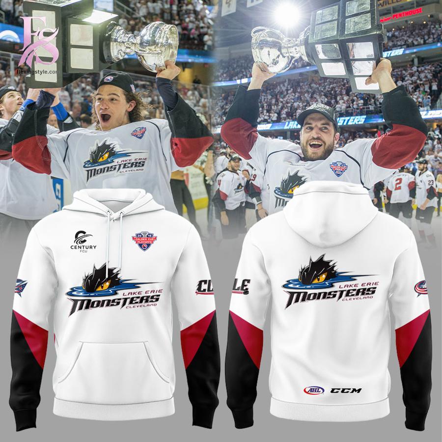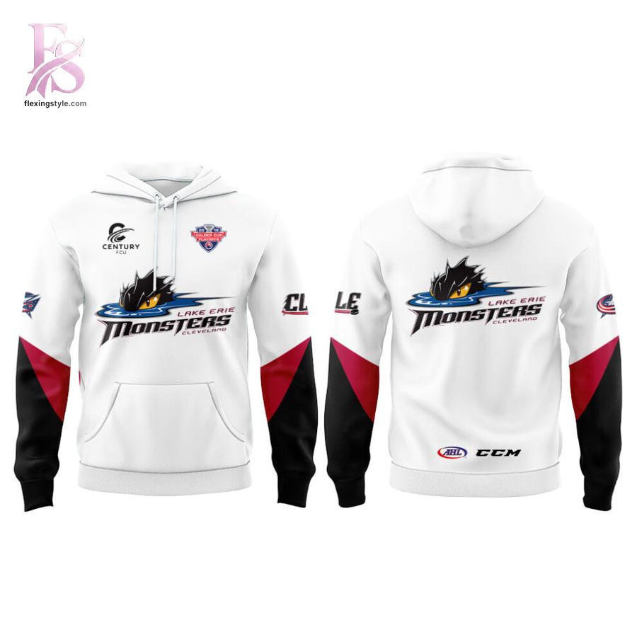Front and center, the hoodie proudly displays the classic Lake Erie Monsters logoβa fierce, snarling monster head with glowing yellow-orange eyes, sharp teeth, and a dynamic blue wave crashing beneath it, all set against a clean white base. The design explodes with energy: “LAKE ERIE Monsters” arcs boldly in black and blue lettering, accented by red and black sleeves that create a striking color-block effect. Subtle championship pride shines through with patches like the Calder Cup emblem and “CENTURY ECU” detailing on the chest, plus “CLEVELAND” scripted proudly on one side. The back mirrors the intensity with a large, vibrant monster logo bursting across the shoulders, complete with “CLEVELAND” arched above and sponsor logos like AHL and CCM adding authentic flair. The contrasting red-black panels on the arms and sides give it a modern athletic vibe, while the cozy hood and kangaroo pocket keep things practical.