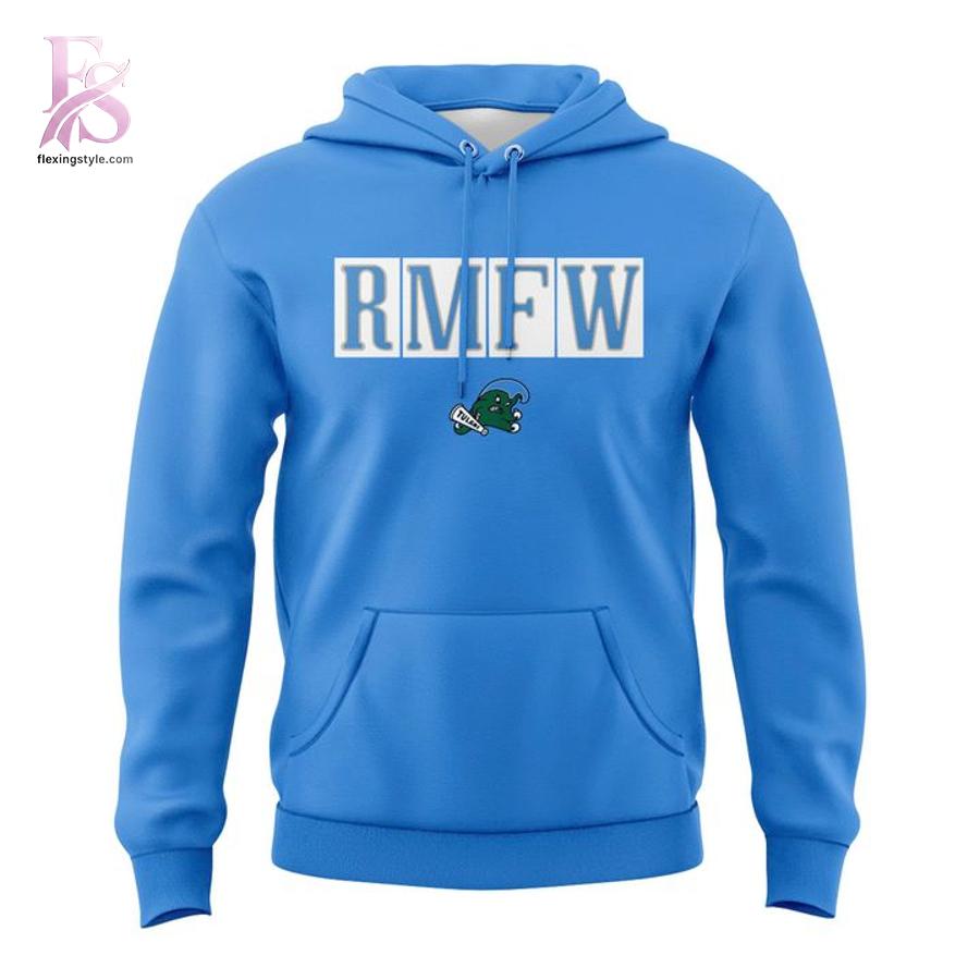 The hoodie features the distinctive “RMFW” lettering across the chest in crisp white, accompanied by Tulane’s iconic Angry Wave mascot logo. The back of the hoodie showcases the same fierce Green Wave mascot in larger form, creating an eye-catching design that fellow fans will instantly recognize. The legendary Angry Wave emblem combines deep green with white accents, perfectly contrasting against the bright blue backdrop.