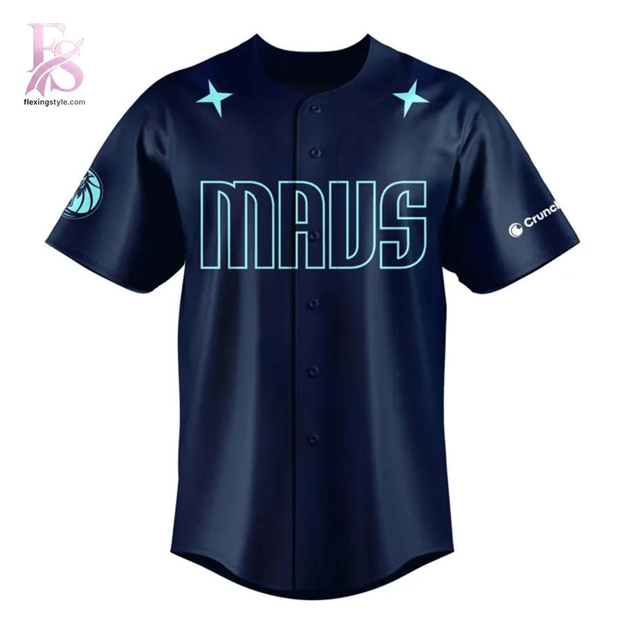 The first thing you’ll notice is the deep navy-blue base, creating a sleek, night-game vibe that feels powerful and refined. Across the front, the “MAVS” lettering is rendered in a sharp, futuristic font, accented with cool-toned highlights that echo Solo Leveling’s intense, supernatural style. Star details near the shoulders add a subtle nod to elite performance, while clean button-down construction keeps the look authentically baseball-inspired.