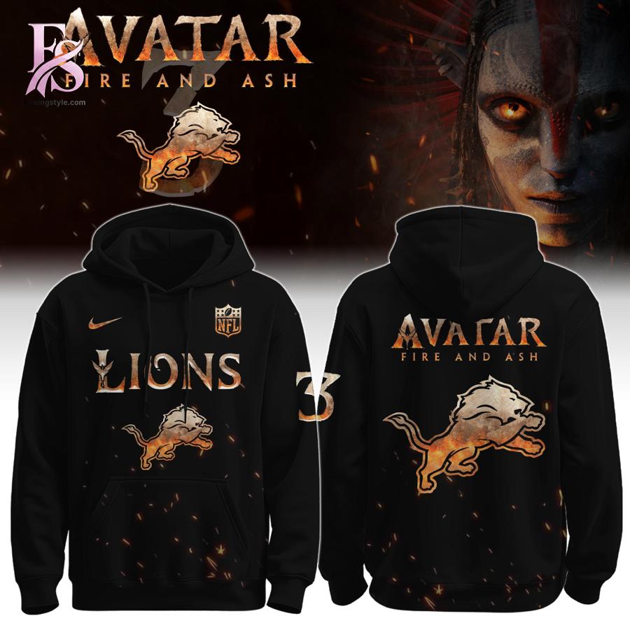 Set against a deep black base, the design is ignited with fiery orange and ash-toned details that feel intense and dramatic. The front features the iconic Detroit Lions logo reimagined in a blazing, flame-kissed style, paired with “Lions” lettering and subtle football-inspired accents that immediately signal team loyalty. On the back, the “Avatar: Fire and Ash” theme takes center stage, with bold typography and a roaring Lions graphic that looks forged from embers-giving the hoodie a cinematic, almost mythic edge. Floating spark and ash effects across the fabric add depth and movement, making the design feel alive rather than flat.
