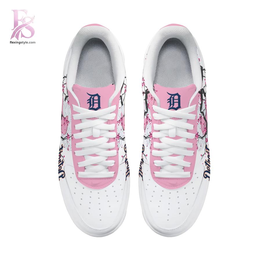These eye-catching custom sneakers blend classic Air Force 1 comfort with stunning Detroit Tigers flair and serene Japanese artistry. Picture this: crisp white leather uppers pop against vibrant pink accents on the swoosh, heel tab, and collar. Intricate side panels feature a dreamy pink-hued landscape with black cherry blossom branches heavy with delicate pink blooms, a traditional red torii gate silhouetted against misty mountains, and subtle wave patterns at the base. “Detroit” appears in elegant navy script across the midfoot and toe, while the iconic Tigers “D” logo graces the tongue and heel in signature blue and orange. White laces and a clean white midsole with embossed “AIR” complete the premium look-perfectly captured in the product images above, shown from multiple angles on a classic brown shoebox.