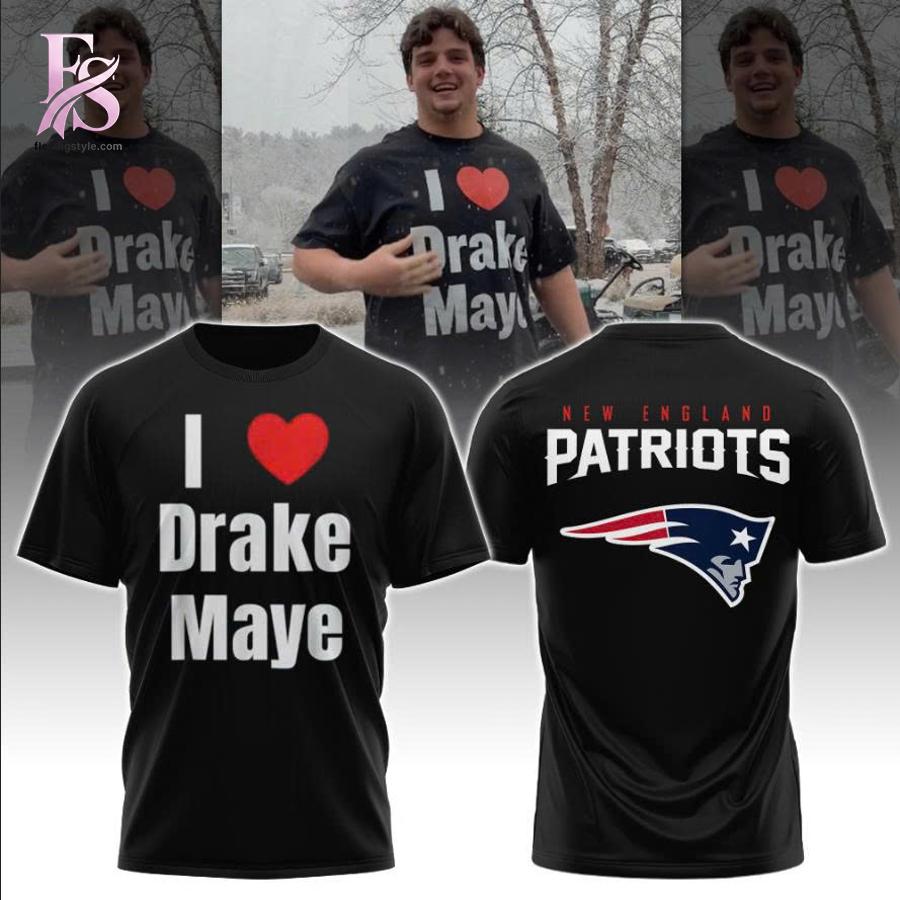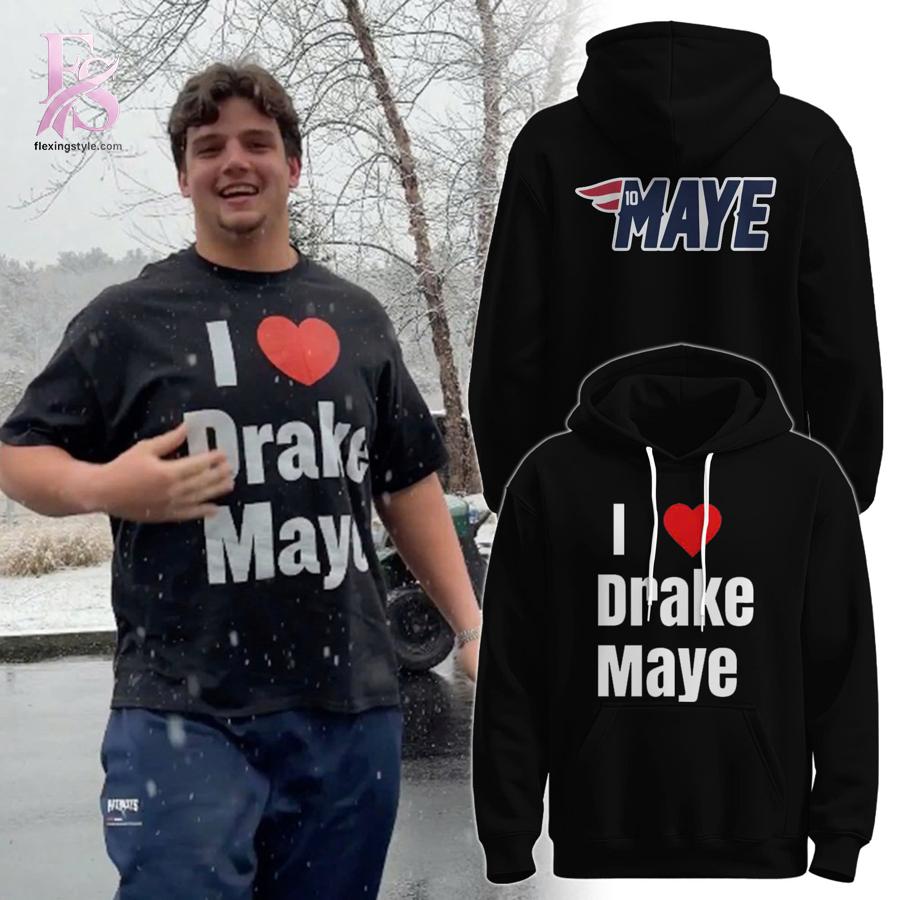 The standout design features the eye-catching “I ❤️ Drake Maye” graphic on the front, delivering a fun, passionate message that instantly connects with fellow fans. On the back, the clean “Maye” name and Patriots-inspired logo details add balance and authenticity, making this Drake Maye hoodie both playful and proudly team-focused. The sleek black colorway enhances versatility while allowing the graphics to pop, giving it a modern, fan-forward look that works well beyond game day.