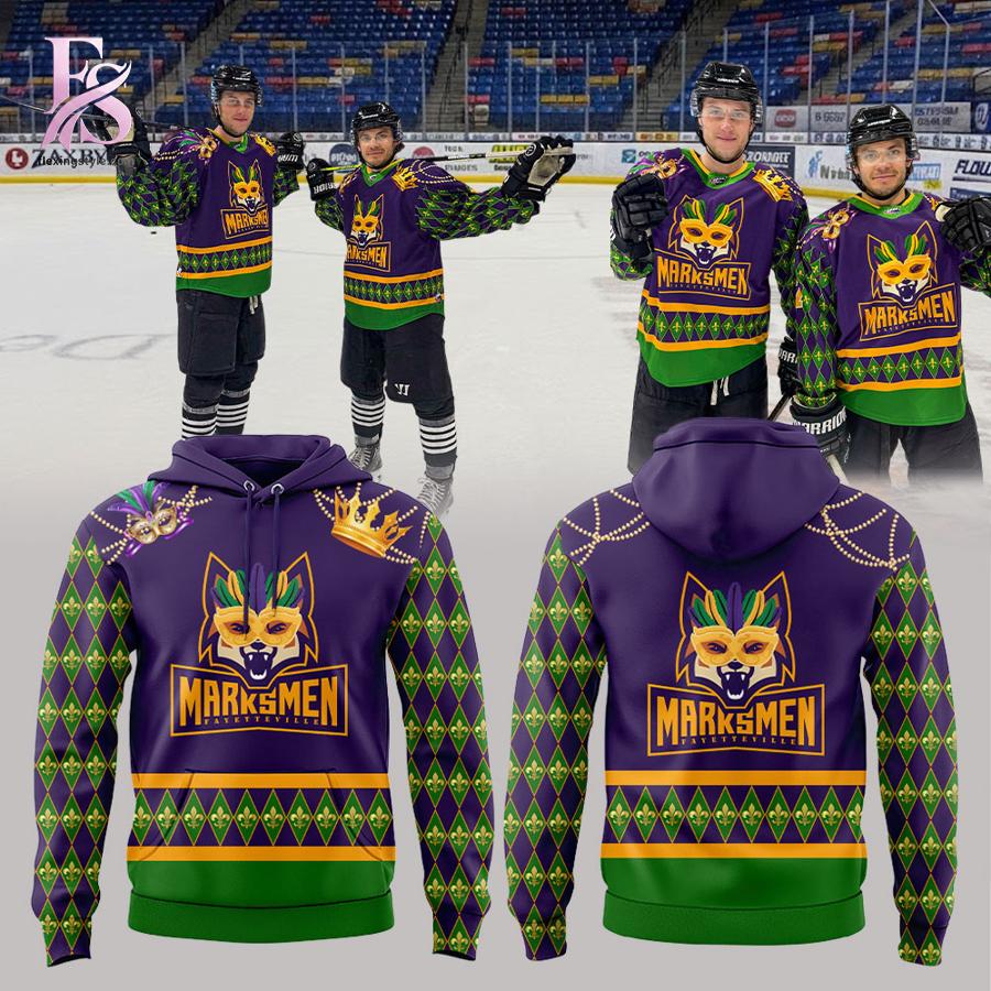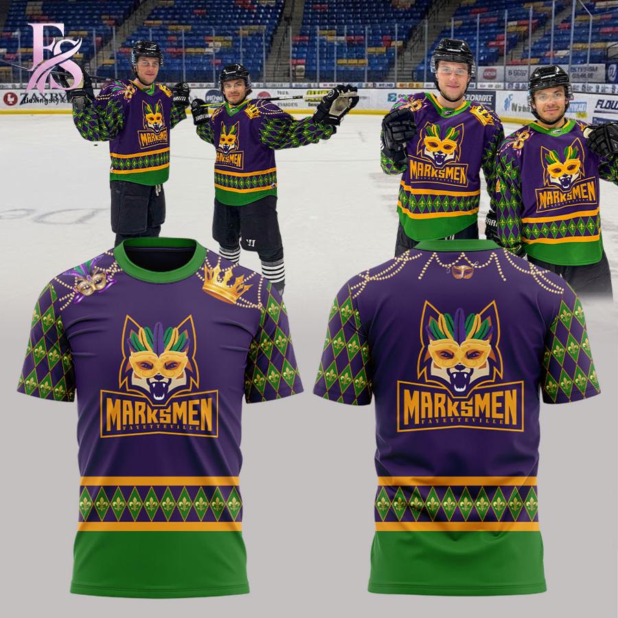 The shirt features a stunning, all-over print that masterfully blends the Marksmen’s identity with traditional Mardi Gras elements. The centerpiece is the fierce Marksmen fox logo, uniquely updated with a festive gold masquerade mask. Draped in rich purple, emerald green, and gold, the jersey-style tee is adorned with intricate diamond patterns, fleur-de-lis accents, and printed gold bead strands that “hang” around the neckline. Even the shoulders are detailed with a regal crown and mask imagery, ensuring you look the part of hockey royalty.