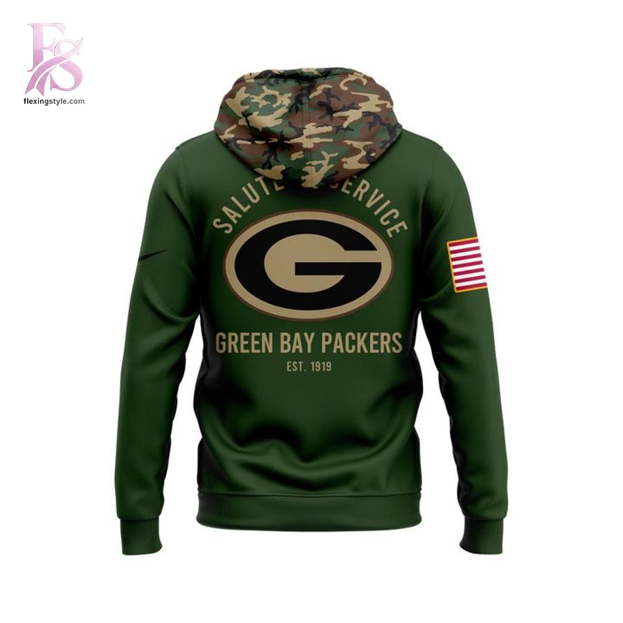 The design continues on the back with an oversized Packers logo framed by clean “Salute to Service – Green Bay Packers” lettering and the team’s established year. American flag patches on each sleeve bring an authentic patriotic touch, while the subtle Nike-style detailing completes the modern athletic vibe.