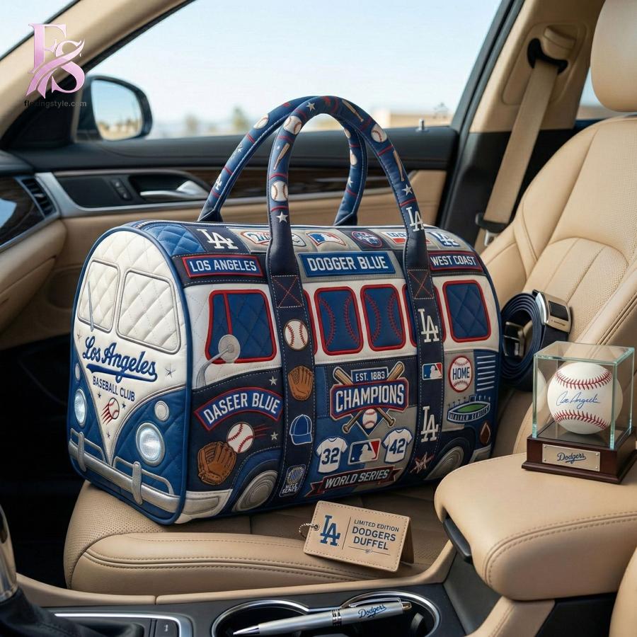 Right away, the bag’s standout design grabs attention. Inspired by a vintage bus aesthetic, the front features a detailed, quilted pattern that mimics classic automotive lines, combined with iconic Dodgers elements. The rich “Dodger Blue” and white color palette is accented with red stitching, creating a dynamic contrast that feels both sporty and stylish. Across the surface, you’ll find embroidered patches and graphics like “Los Angeles Baseball Club,” “Champions,” and “World Series,” along with baseball motifs, gloves, and bats that bring the design to life.