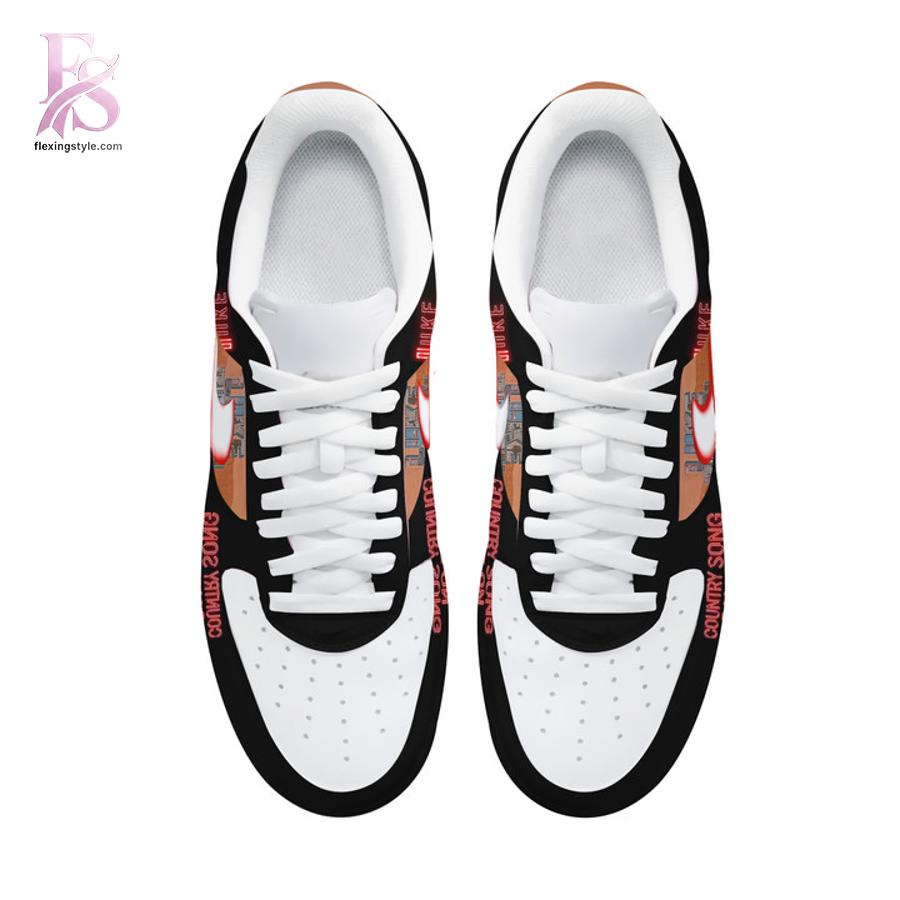 Crafted on the legendary Nike Air Force 1 low-top silhouette, these sneakers boast a premium leather upper in sleek black and white, ensuring durability and timeless appeal. The standout feature is the vibrant custom artwork: a glowing neon red swoosh spells out “Luke Bryan” alongside nostalgic elements like his guitar-strumming pose, the “Country Song Came On” lyric boldly emblazoned on the side, and nods to his Farm Tour 2025. Subtle details, including tour license plate graphics and signature accents, transform these into wearable art that celebrates Luke Bryan’s country roots. Whether you’re tailgating at a concert or strolling city streets, these Luke Bryan custom sneakers let you showcase your fan spirit with every step, turning heads and sparking conversations among fellow country enthusiasts.