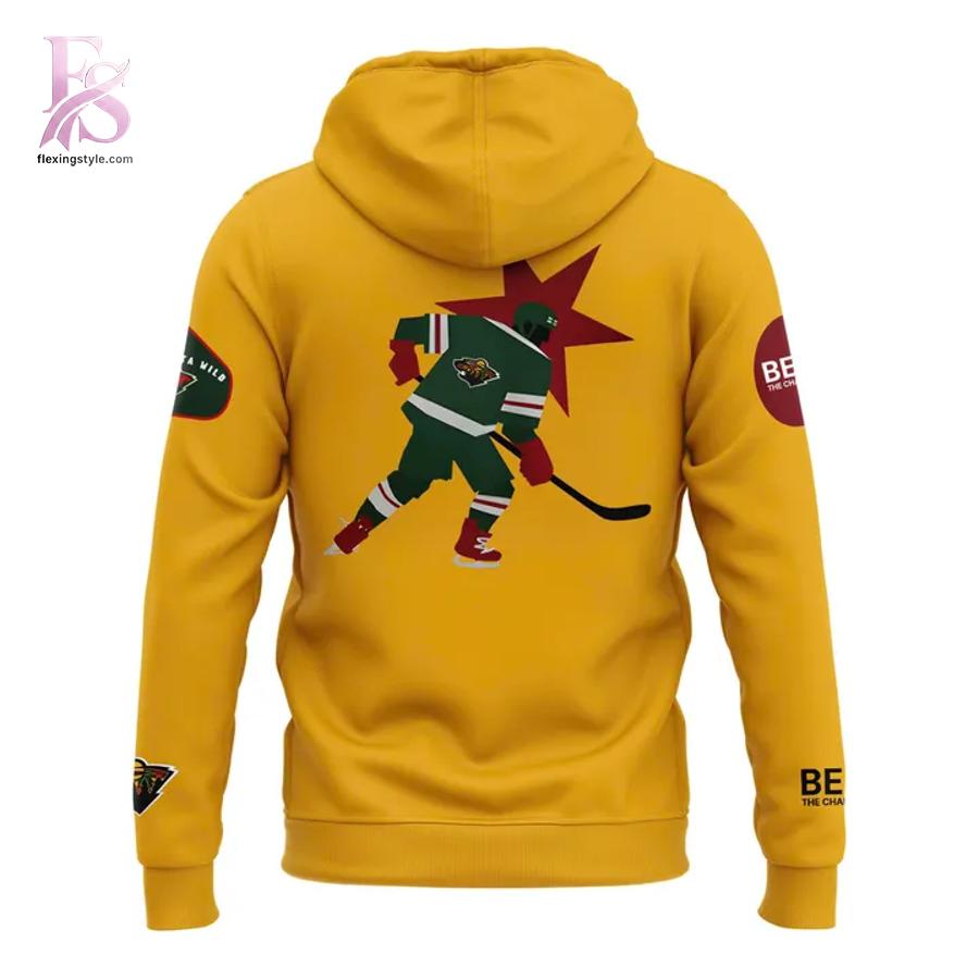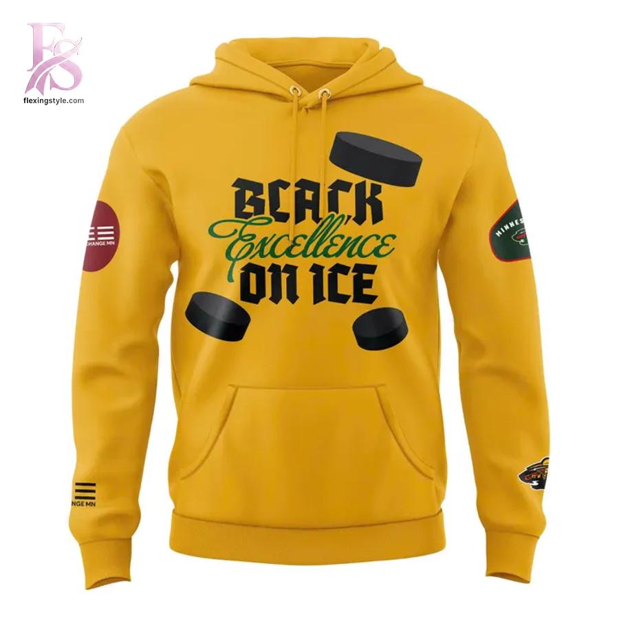 The striking golden yellow hoodie makes an immediate statement with its distinctive “Black Excellence On Ice” typography on the front, accompanied by dynamic hockey puck graphics. The back features a silhouetted hockey player in Wild team colors, incorporating the iconic Minnesota Wild green with a bold red star, creating a powerful visual that captures the spirit of the game.