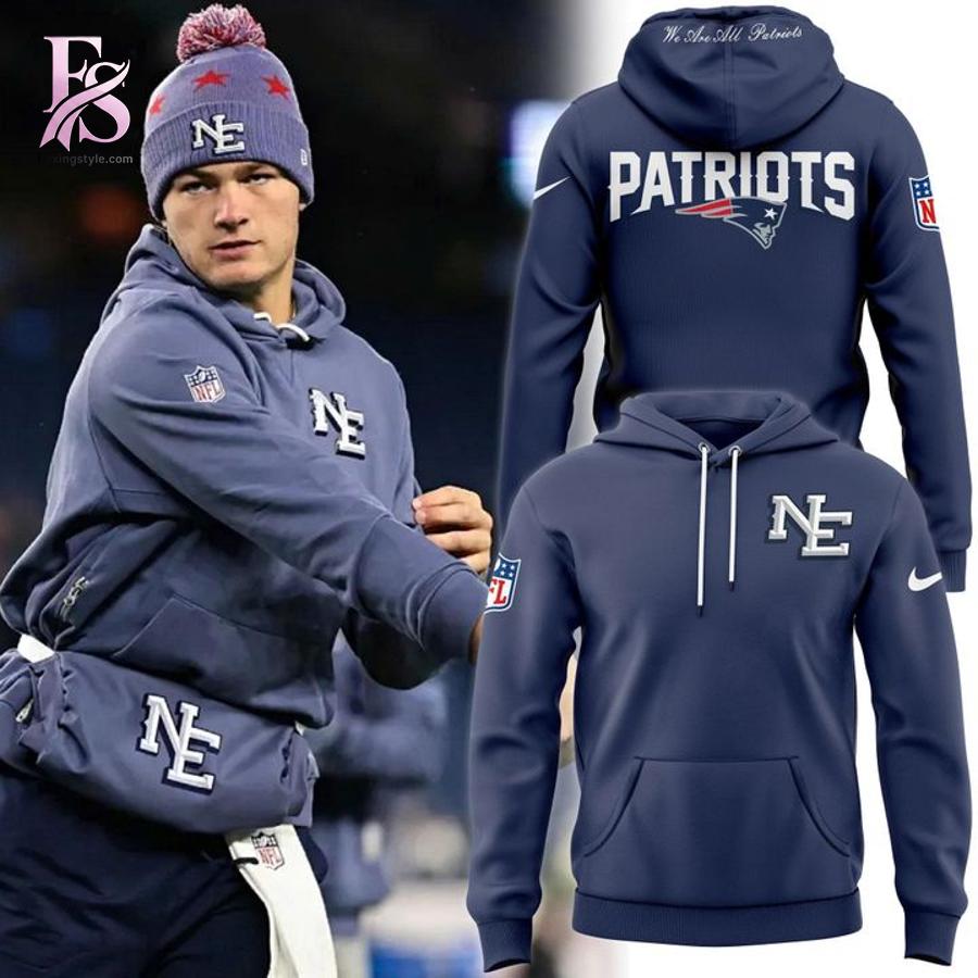 Visually, this 2025 NFL sideline hoodie impresses in deep navy blue, mirroring the team’s classic colors with a sleek, professional vibe. The front boldly features the embroidered “NE” logo in crisp white, standing out like a beacon of regional pride, while sleeve patches-including the NFL shield and Nike swoosh-add authentic pro details with subtle textures for that premium feel. Flip to the back, and “PATRIOTS” arcs powerfully in white above the iconic Flying Elvis emblem, infused with red and blue accents that pop dynamically. The inner hood’s subtle “We Are All Patriots” script adds an emotional, unifying touch, blending smooth fabric with raised embroidery for a tactile, high-quality finish.