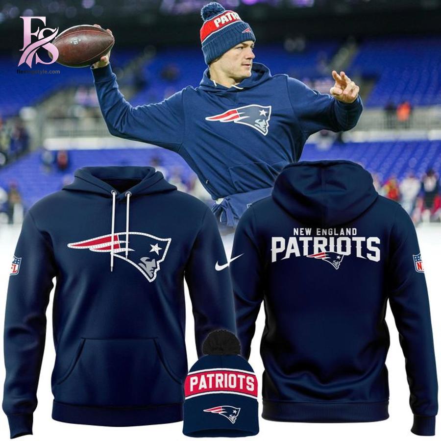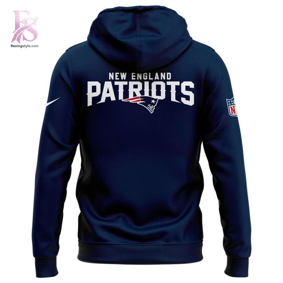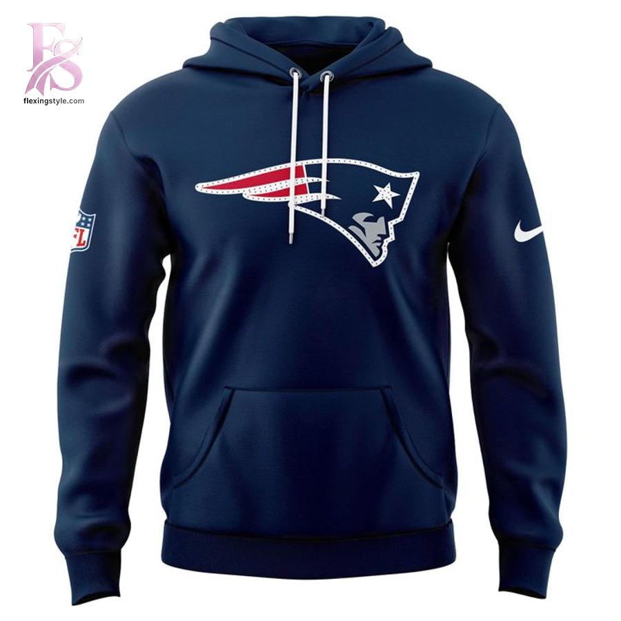 The design is clean, powerful, and instantly recognizable. Rendered in a deep navy blue, the hoodie features the classic Patriots logo boldly displayed across the chest, combining red, white, and silver tones for a sharp contrast that pops without feeling loud. The lines are crisp and modern, giving the front a strong, athletic presence. On the back, “NEW ENGLAND PATRIOTS” is printed in bold white lettering, reinforcing team loyalty from every angle. Subtle sleeve details inspired by professional league styling add authenticity and elevate the overall look.