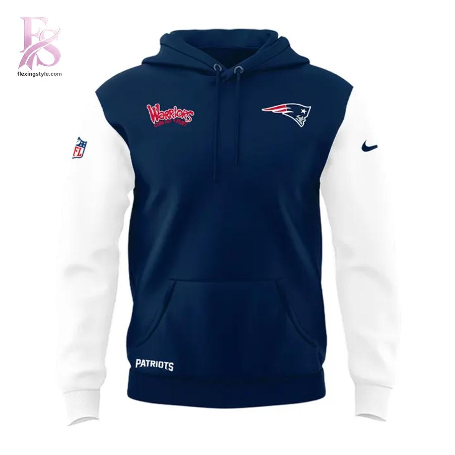 From the image, the hoodie features a striking navy blue body paired with crisp white sleeves, creating a clean, athletic contrast that instantly catches the eye. On the front chest, the official New England Patriots logo sits proudly, balanced by a vivid “Warriors” graphic in red script, adding an edgy, graffiti-inspired twist. Turn it around and the design really makes a statement — a large “The Warriors” back print with bold red lettering and character artwork, giving the hoodie a vintage streetwear vibe that stands out in any crowd. Subtle details like the sleeve patch, kangaroo pocket, and matching drawstrings tie the whole look together for an authentic, sideline-ready finish.