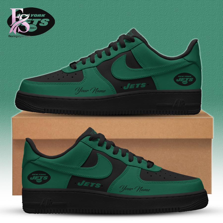 From the image, the shoes feature a striking deep green and matte black colorway, a perfect nod to the New York Jets’ signature look. The rich green leather panels contrast cleanly against black overlays, laces, and sole, creating a sharp, confident profile. Subtle Jets branding appears along the side panels and heel, while the swoosh blends seamlessly into the design for a cohesive, premium feel. A standout detail is the custom name option elegantly scripted on the side, adding a personal touch that makes each pair uniquely yours.