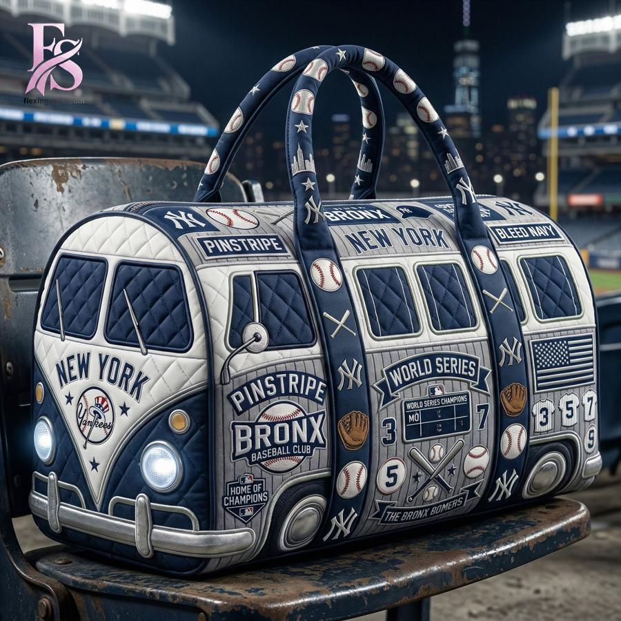 The moment you see it, the bag commands attention with its crisp navy-and-cream colorway and rich quilted navy diamond panels that give it a luxurious, high-end texture. The entire design is a love letter to Yankees history: bold interlocking “NY” logos, classic baseball seams, crossed bats, leather gloves, and iconic text like “PINSTRIPES,” “BRONX BASEBALL CLUB,” “WORLD SERIES,” and “HOME OF CHAMPIONS.” One side features a vintage bus motif complete with headlights and “NEW YORK” lettering, while an American flag, scoreboard details, and scattered baseballs complete the authentic MLB look. The matching handles are wrapped in a repeating baseball-and-star pattern that ties everything together perfectly.