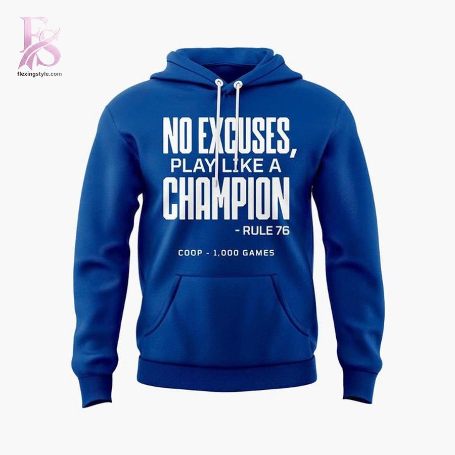 Gear up for victory with the No Excuses Play Like A Champion Tampa Bay Lightning 2026 Hoodie, a must-have tribute to Coach Jon Cooper’s legendary 1,000 games milestone that captures the heart of NHL fandom. Inspired by the team’s unbreakable spirit and that iconic “Rule 76” mantra from Wedding Crashers, this Tampa Bay Lightning apparel lets you embody the champion mindset on and off the ice.