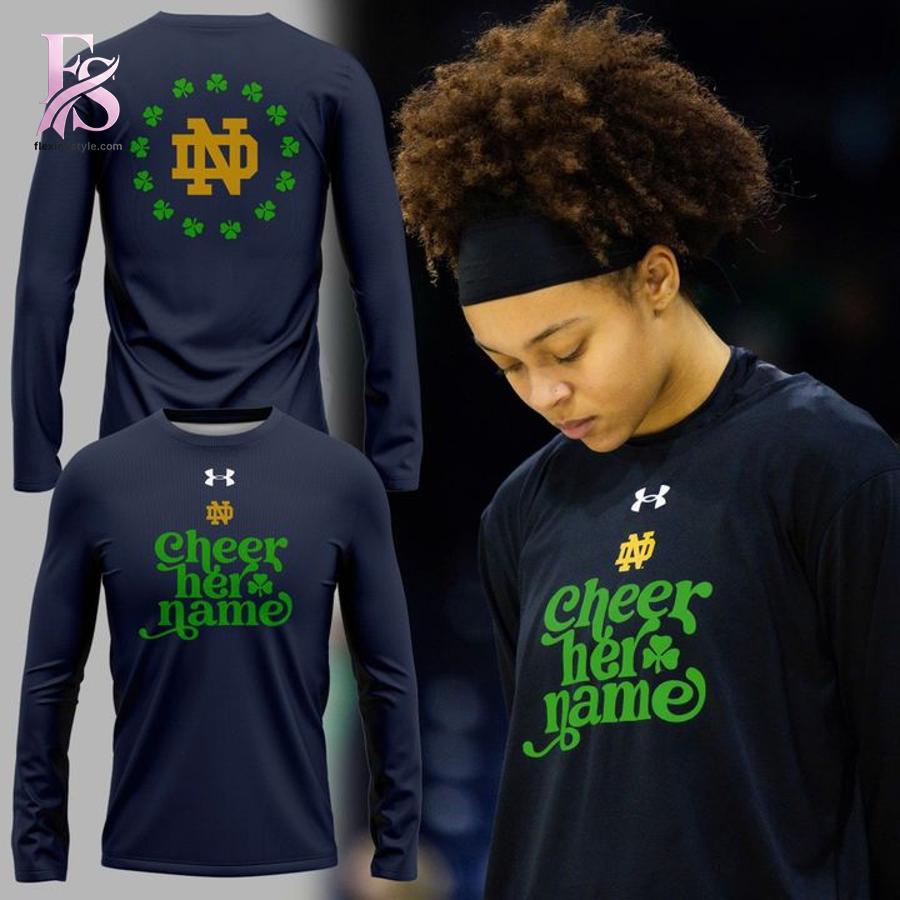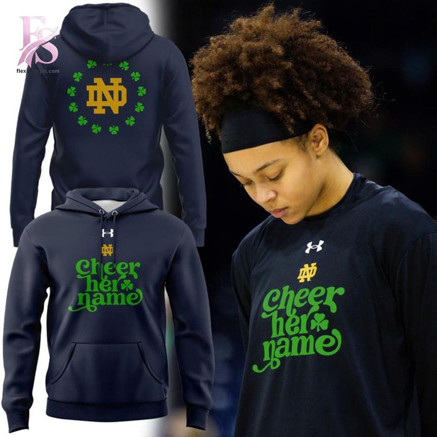 The design immediately captures attention with its iconic Notre Dame Fighting Irish logo paired with vibrant green shamrock accents, symbolizing tradition, luck, and strength. Front and center, the inspiring “Cheer Her Name” typography delivers a heartfelt message of support, making this hoodie especially meaningful for fans rallying behind women’s athletics, students, or loved ones connected to Notre Dame. The deep navy base keeps the look classic and versatile, while the bold graphics ensure your loyalty never goes unnoticed.