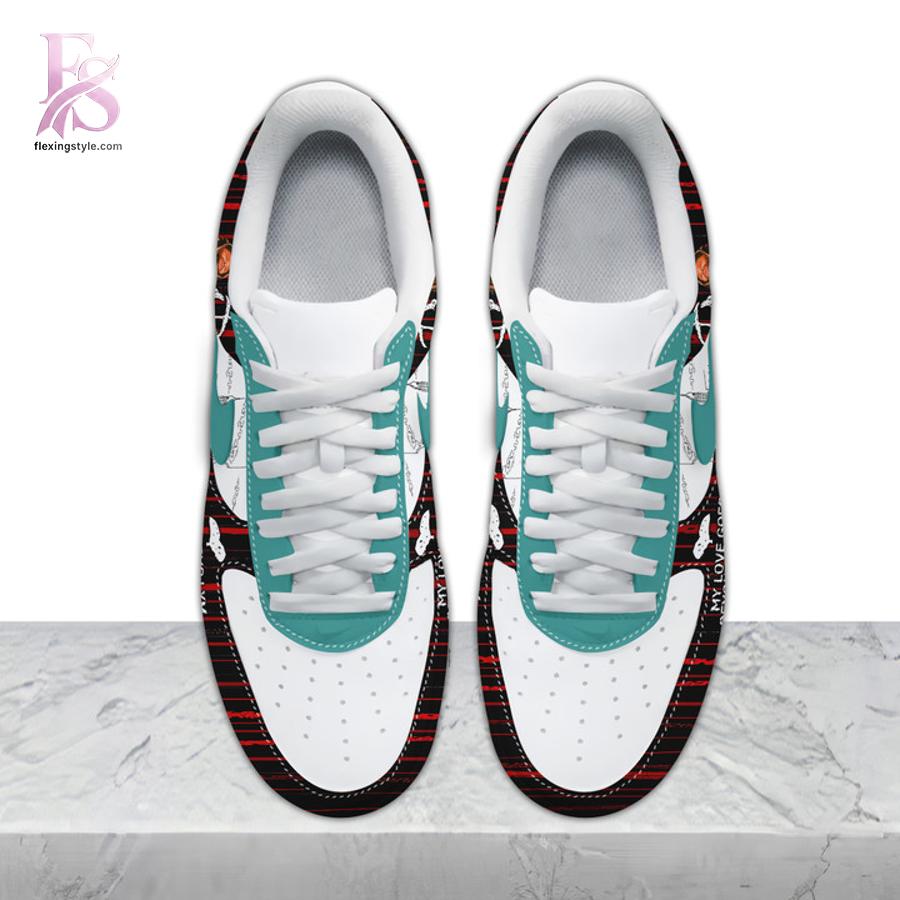 Handcrafted with premium high-definition prints, these The Weeknd custom Air Force shoes feature striking images of the Starboy himself in dramatic poses, overlaid on a sleek white base with teal Nike swooshes that nod to the OKC Thunder’s vibrant colors. Iconic XO logos dominate the sides, while phrases like “My Love Goes Beyond The Pain” add emotional depth and artistic flair. Intricate crowd sketches and striped patterns evoke the energy of live performances and packed arenas, making every step a tribute to both The Weeknd’s legacy and Thunder basketball passion.