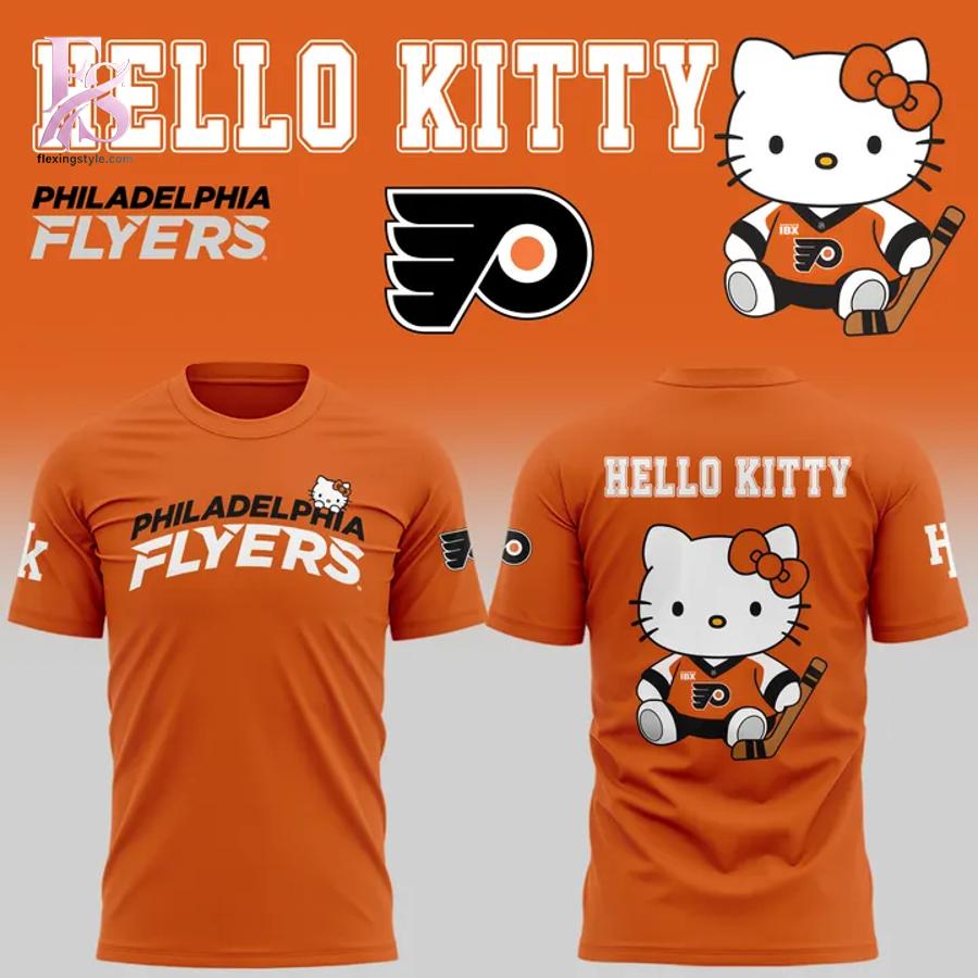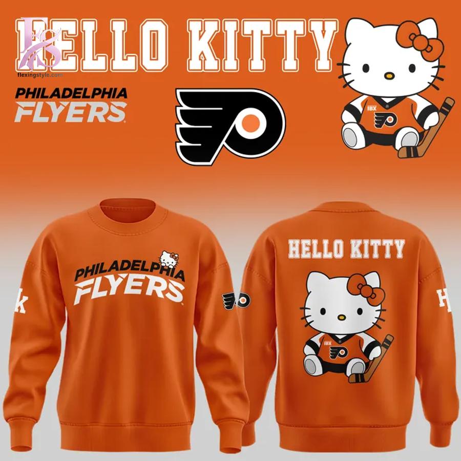 Visually, the hoodie makes a bold statement with its vibrant Flyers orange base, a color that radiates energy and team pride. The front features “Philadelphia Flyers” text in clean, athletic lettering, accented by a small Hello Kitty graphic that adds a subtle touch of cuteness without overpowering the design. Turn to the back, and the hoodie truly comes to life: a large, adorable Hello Kitty character dressed in Flyers-inspired gear, complete with hockey stick and matching colors. The contrast between the bold sports branding and the soft, playful illustration creates a design that feels both spirited and charming.