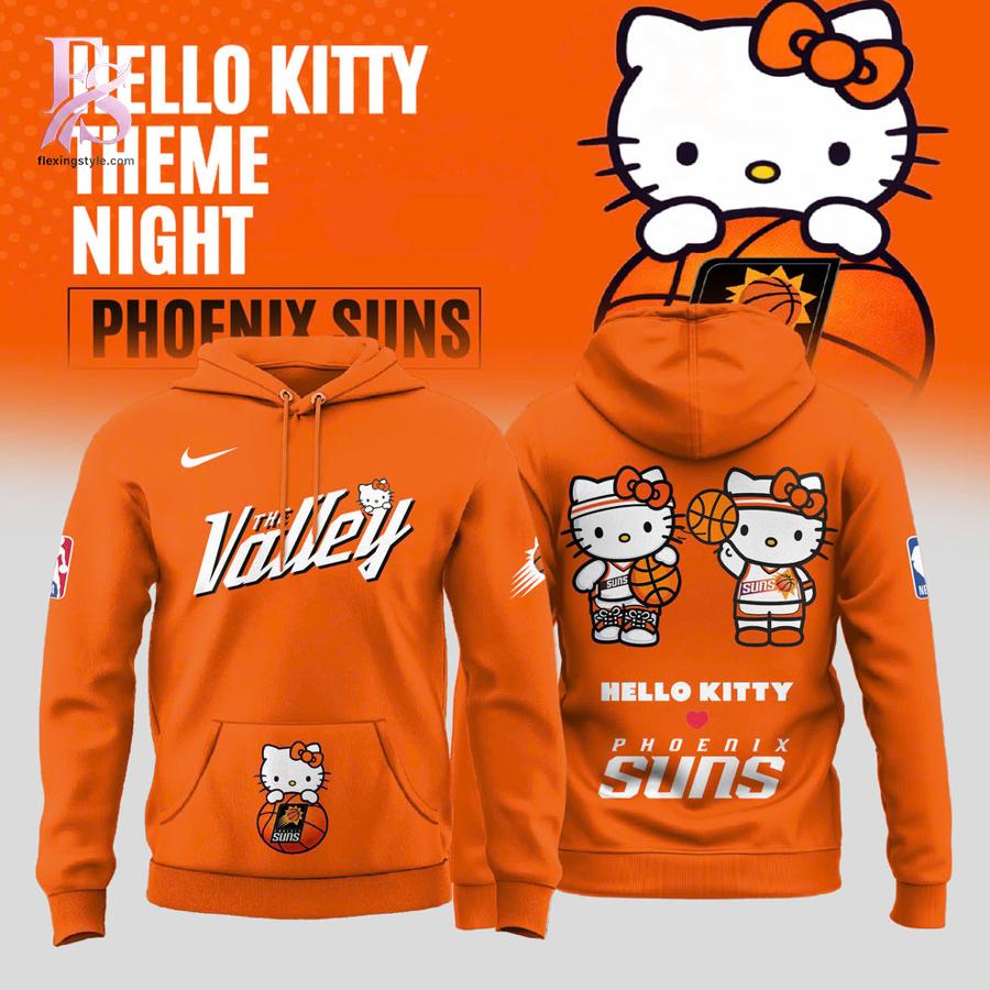 The front features “The Valley” in bold white lettering, complemented by a playful Hello Kitty holding a Suns basketball in the kangaroo pocket area. The back showcases an adorable dual Hello Kitty design, with both characters dressed in Suns gear and ready for game time. The official NBA and Nike logos add authentic professional sports credentials to this unique collectible.
