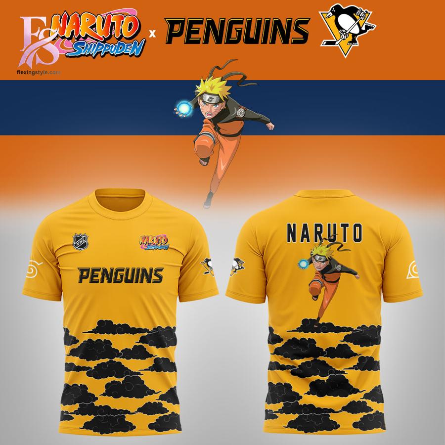 The Pittsburgh Penguins Naruto hoodie features a vibrant “Hidden Leaf Gold” base that commands attention, perfectly blending the team’s iconic colors with Naruto’s signature aesthetic. The front showcases a bold “PENGUINS” wordmark across the chest, flanked by the official NHL and Naruto Shippuden logos. The real showstopper, however, is the intricate design of the sleeves and hem, which are adorned with swirling black Akatsuki-style clouds, adding a touch of shinobi mystery to your game-day fit. On the back, a high-definition graphic of Naruto Uzumaki preparing a Rasengan sits beneath his name, symbolizing the power and determination of both the character and the Pittsburgh franchise.