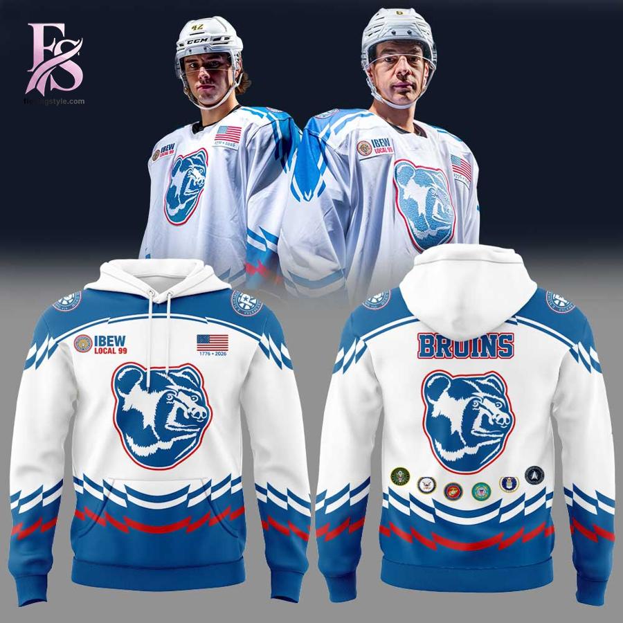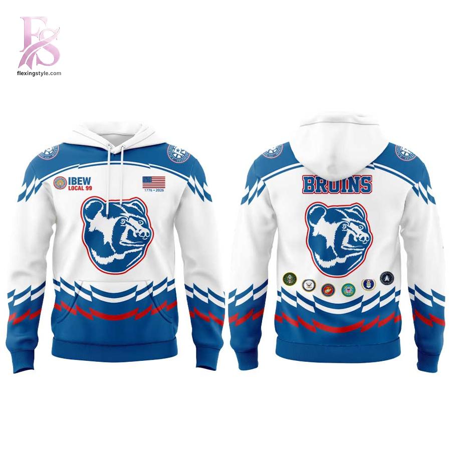 On the front, a large, fierce blue-and-white bear logo roars in the center, surrounded by the IBEW Local 99 patch, a prominent American flag, and “1776 – 2020” tribute. The white hood and kangaroo pocket add practical warmth and classic style. Flip to the back for maximum impact: “BRUINS” arched in bold blue-and-red lettering above the same powerful bear graphic, with a row of official military branch and service seals along the hem-creating a respectful, meaningful display of appreciation.
