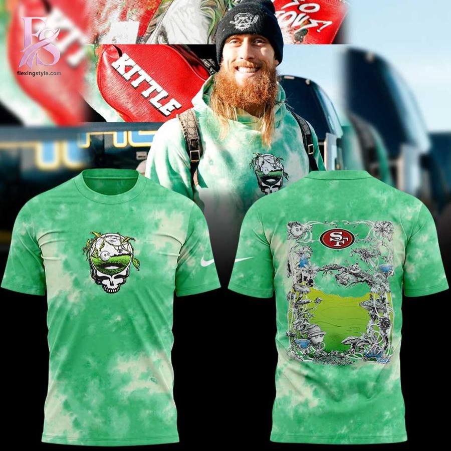 This hoodie rocks a mesmerizing green tie-dye pattern, swirling from soft mint to deep emerald for that authentic, retro festival feel with a modern athletic twist. The front centers on a reimagined Grateful Dead skull, alive with a lush green landscape of mountains, trees, and subtle 49ers red-gold accents that nod to the team’s iconic colors. Flip it to the back, and the real showstopper unfolds: an intricate, psychedelic scene bursting with twisting vines, blooming flowers, dancing bears, and whimsical details all framing a bold San Francisco 49ers logo set against a glowing green valley-pure fan art that captures the harmony of music, nature, and football passion.