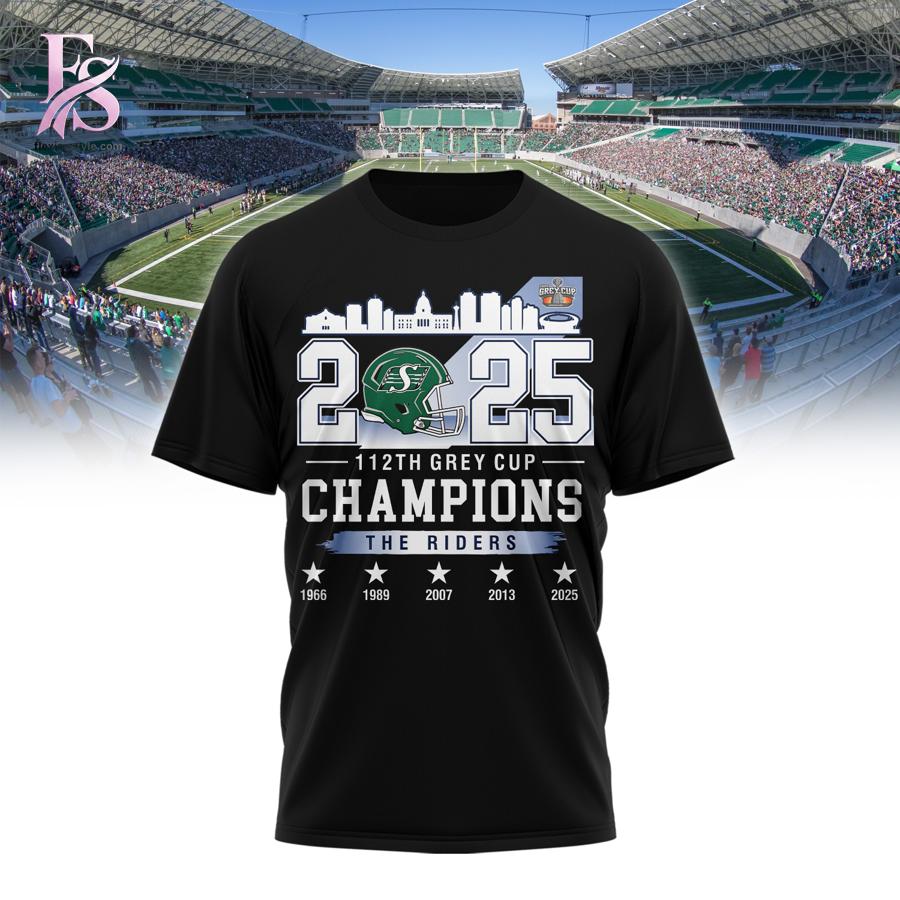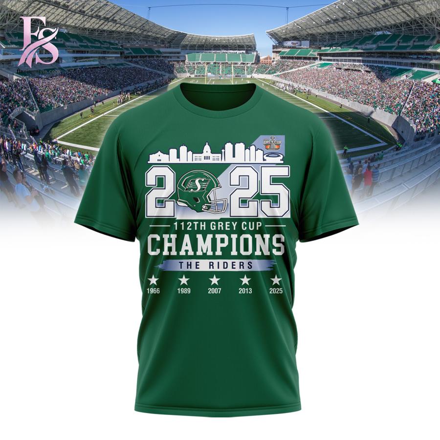 The design of this Saskatchewan Roughriders Grey Cup Champions Shirt is a visual celebration of gridiron excellence. Featuring a bold “2025” and “112TH GREY CUP CHAMPIONS” graphic across the chest, it immediately signals your status as a supporter of the best team in the league. The intricate artwork includes the iconic Roughriders helmet, the official Grey Cup logo, and a sleek city skyline that pays homage to the heart of Saskatchewan. Below the main “THE RIDERS” text, a series of five stars highlights the team’s legacy of greatness, listing every championship year: 1966, 1989, 2007, 2013, and the latest triumph in 2025.