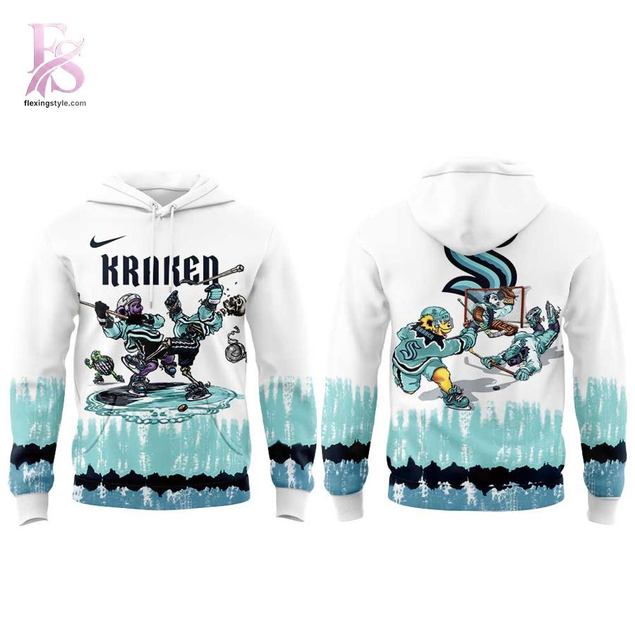 Visually, this hoodie is an instant conversation starter. The crisp white base is accented with cool-toned, ocean-inspired tie-dye patterns in shades of teal and black, echoing the Kraken’s deep-sea identity. On the front, a dynamic, cartoon-style hockey graphic shows a chaotic, high-energy moment on the ice, paired with bold “KRAKEN” lettering and a sleek Nike-style swoosh detail. Flip it to the back, and the design comes alive with another vivid action scene-complete with players, motion, and a striking Kraken “S” logo above it all.
