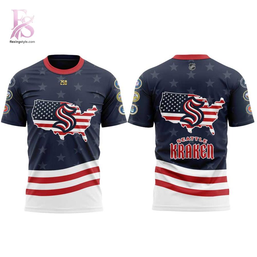Front and center is the showstopper – a stunning outline of the USA map filled with the stars-and-stripes pattern, overlaid by the fierce Seattle Kraken “S” logo in dynamic red, white, and blue. A special “250” detail sits proudly on the chest, while authentic military appreciation patches on both sleeves add meaningful layers of respect. Flip it to the back and the same iconic USA-Kraken graphic commands attention above bold “SEATTLE KRAKEN” lettering in fiery red, with the official NHL logo at the neck for that true pro look.