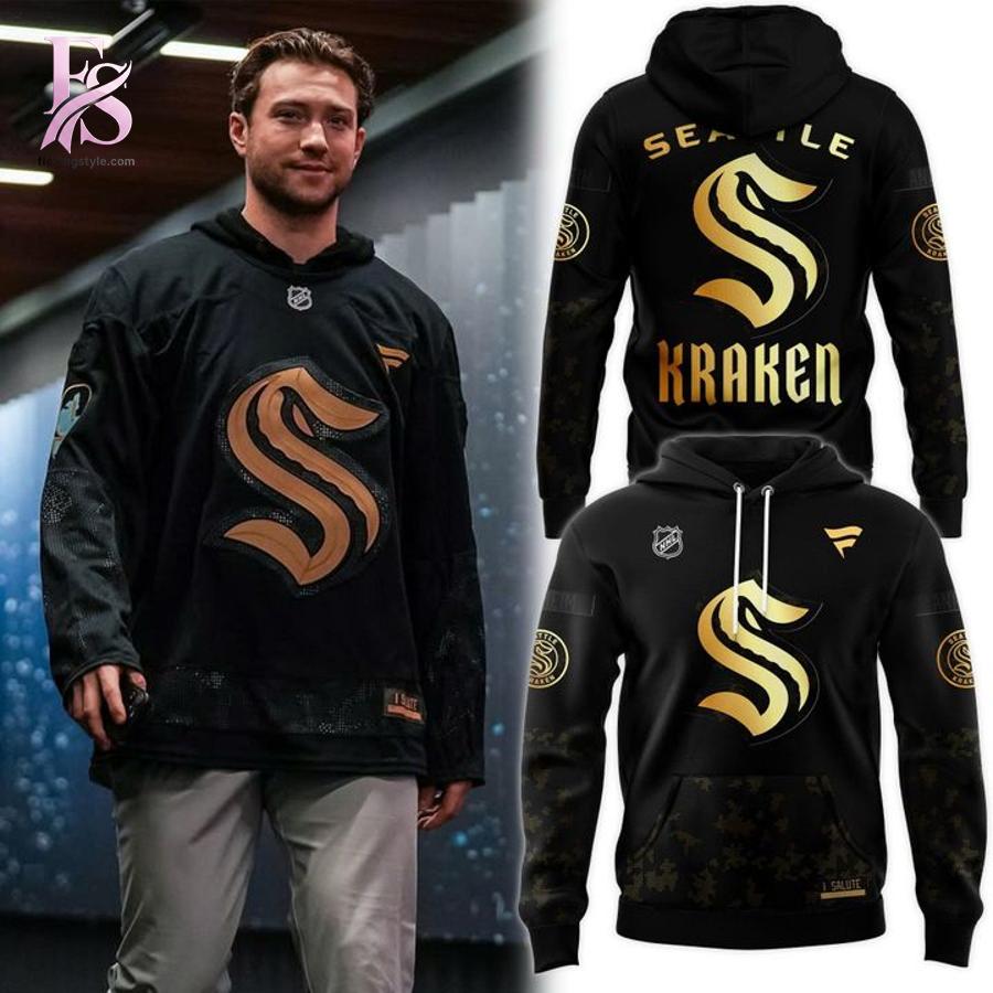 This Seattle Kraken Military Appreciation Night Hoodie 2025 is more than just fan apparel—it’s a statement of pride. It allows you to honor service members while showcasing your devotion to the Kraken in a stylish, modern way. From the rich gold accents to the crisp logo placement and camouflage detailing, every element on this hoodie is designed to stand out.