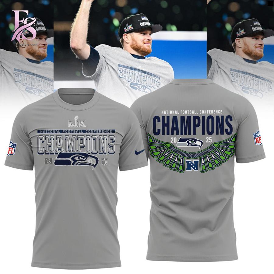 The hoodie comes in a clean championship gray, giving it a modern, versatile look that lets the graphics stand front and center. On the front, the powerful “National Football Conference Champions” text is layered with the iconic Seahawks logo, creating a strong, official game-day feel. The design is sharp and athletic, accented with deep navy tones that reflect Seattle’s unmistakable identity. Flip to the back, and the hoodie truly shines-featuring a large, eye-catching championship graphic with 2025 proudly displayed, framed by wing-inspired elements in Seahawks blue and green that symbolize speed, strength, and dominance.