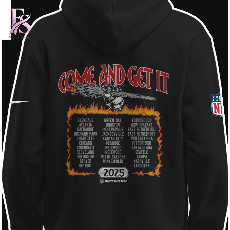 Turn it around, and the back design goes even harder. The fiery red-and-orange “COME AND GET IT” headline sits above a bold tour-style layout, listing cities and dates tied to the 2025 season. Framed by flame-inspired graphics, this back print gives the hoodie a rugged, almost rock-tour aesthetic that feels aggressive, competitive, and unapologetically bold.