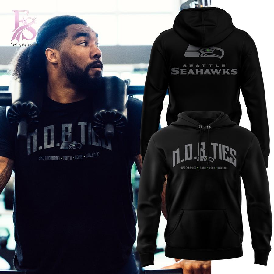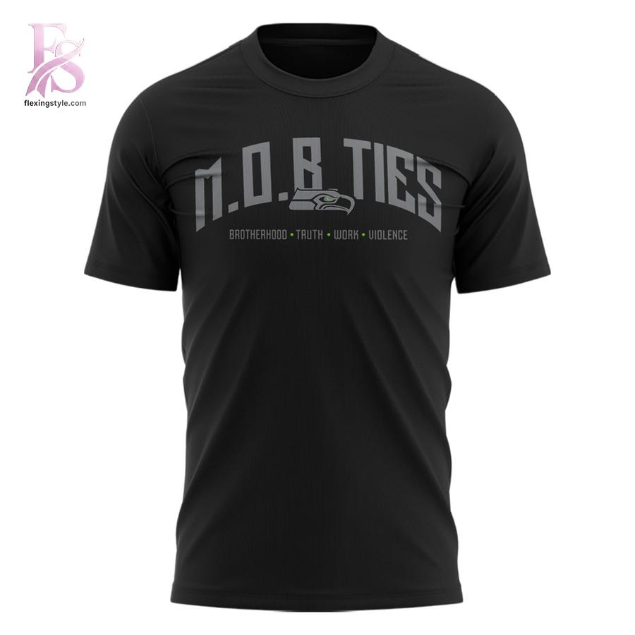 The visual design draws from gritty, motivational vibes: a deep black base evokes the team’s fierce intensity, accented by sleek metallic gray “M.O.B. TIES” scripting arched across the sides, cleverly weaving in the iconic Seahawks hawk eye logo for that unmistakable team nod. Subtle etched details like “BROTHERHOOD • TRUTH • WORK • VIOLENCE” wrap around the heel or vamp, adding an empowering mantra without clutter. The smooth, matte textures blend seamlessly with glossy accents, creating a modern, edgy look that’s versatile for casual wear or pairing with jeans and jerseys.